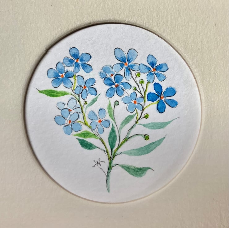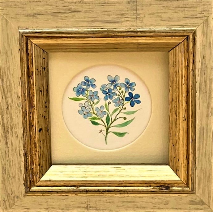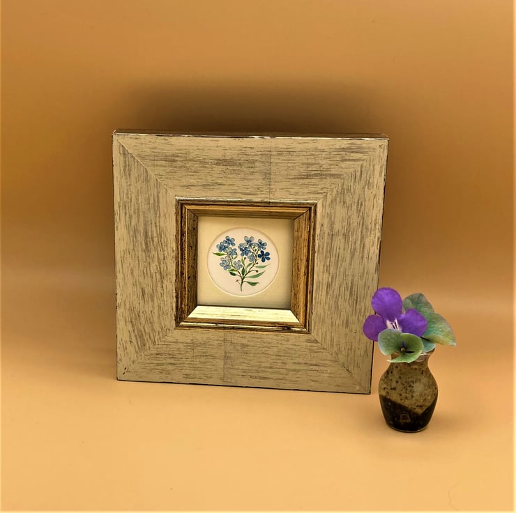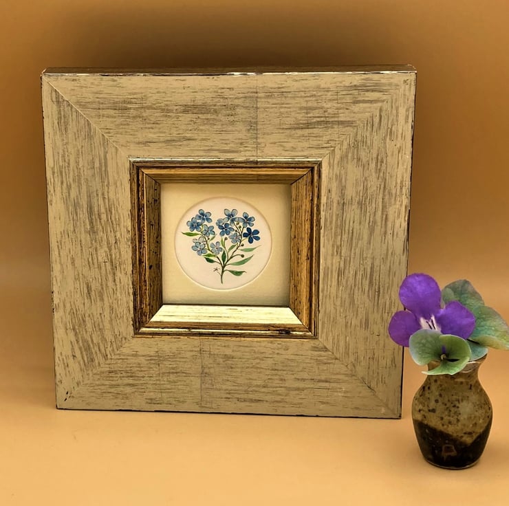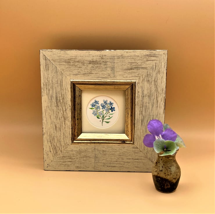 This small original framed watercolour painting of sky blue forget-me-not's is signed & dated by me. Painted using the best professional artist quality materials the sky blue flowers and fresh green foliage is enhanced by the choice of a lightly distressed cream and gilt frame. The fragility and delicacy of the pretty flowers make this little painting an attractive gift for any occasion.