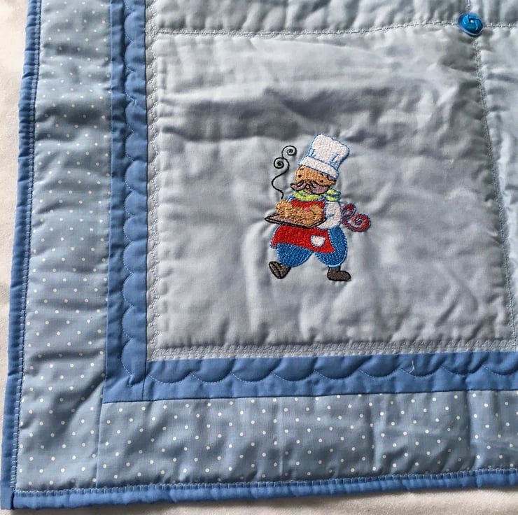 Quilted and decorated with machine stitches and buttons, this quilt measures 34” square and is machine washable at thirty degrees.