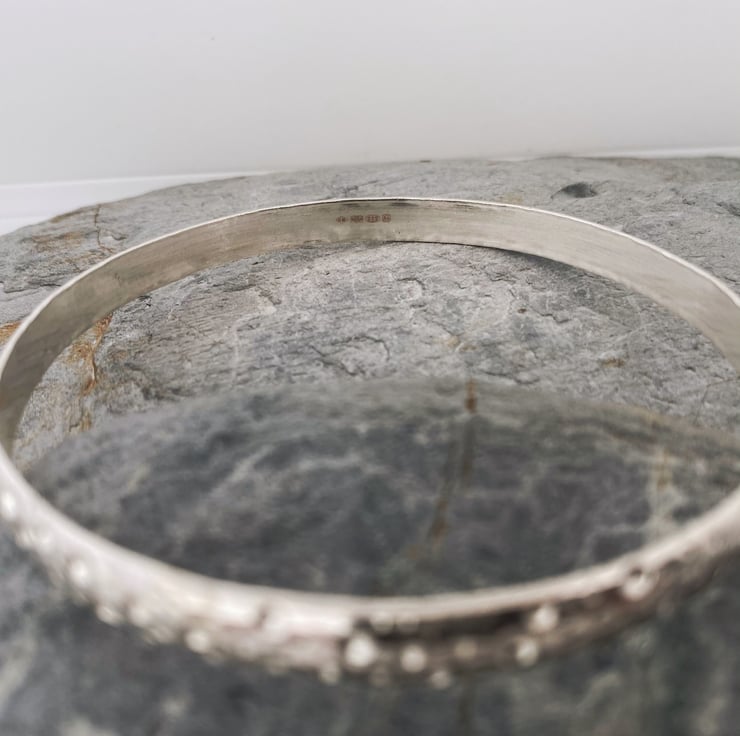 Solid sterling silver bangle with a unique hammered and textured finish.