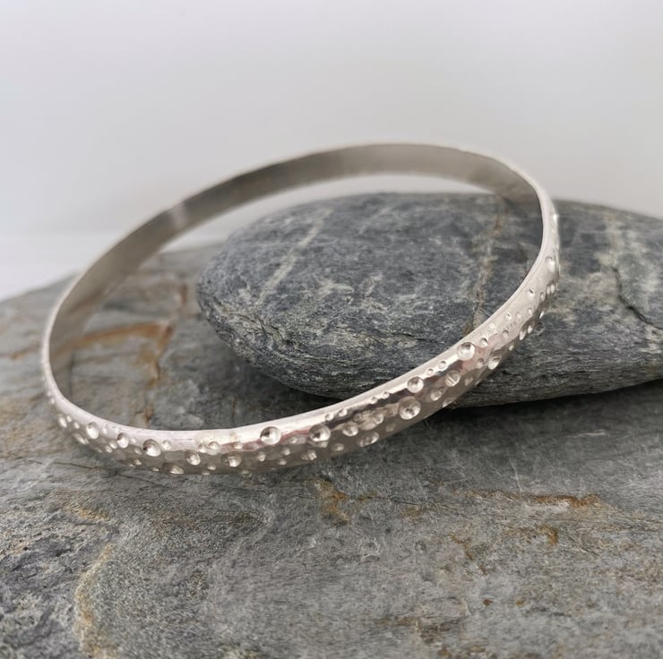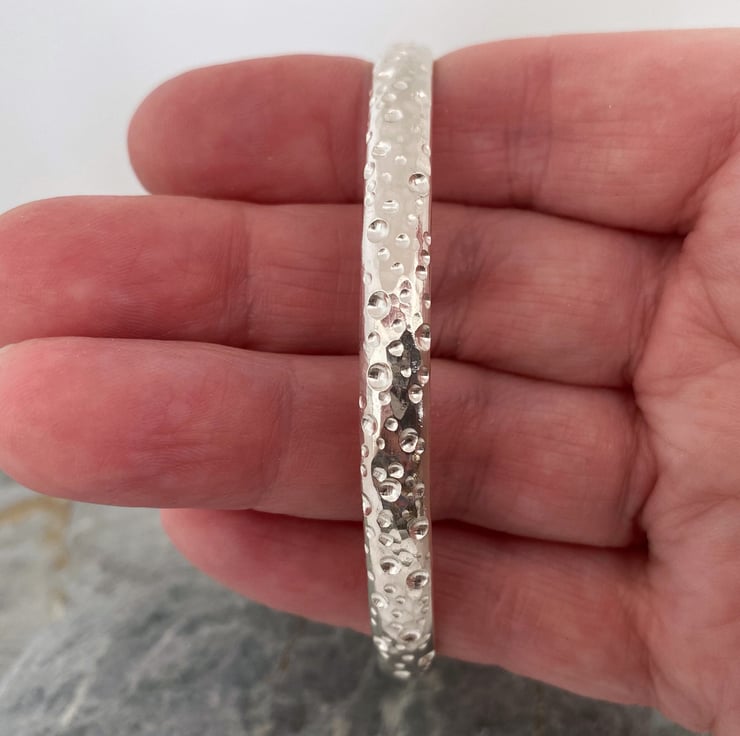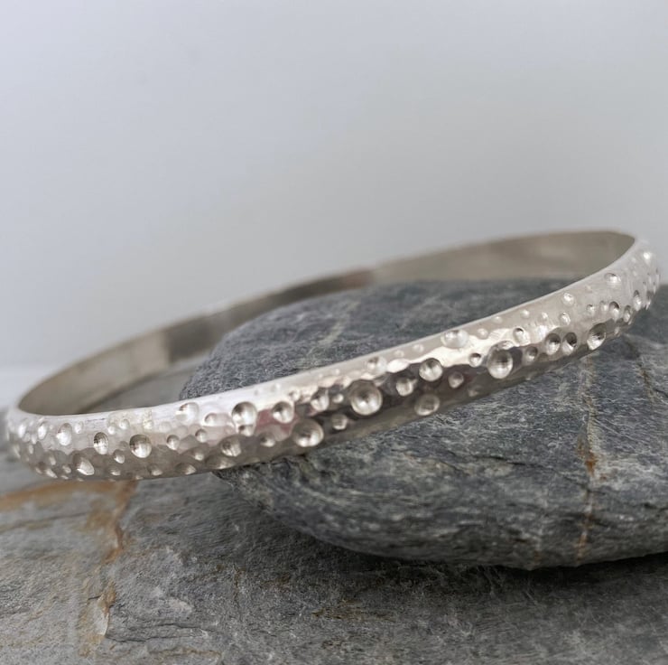Made from hallmarked sterling silver, this chunky bangle has an unusual textured pattern I’ve developed made first with a hammer and then by drilling out little bubbles with a burr. The texture is quite tactile and catches the light so it’s very sparkly.