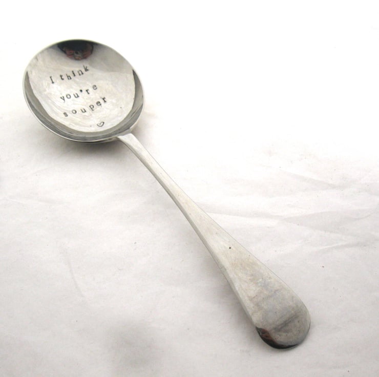 Vintage soup spoon hand stamped with 'I think you're souper' and a little heart. This one is a second as the metal was a bit hard and some of the letters didn't impress too well, so it's in the bargain bin. But I'm hoping its message, and the groanworthy pun, will be appreciated despite the imperfection!