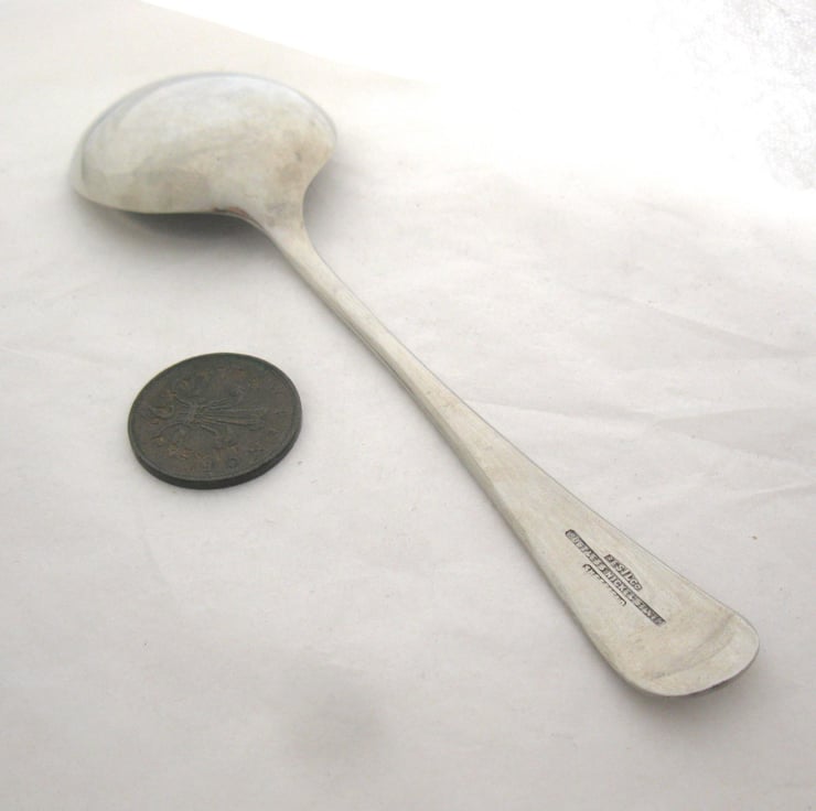 It's a plain 'old english' spoon with a round bowl and it's approx. 17cm long. I think it dates from the 1940s. Nice and solid and will last for years. Hand wash if you want the lettering to stay black - the black is waterbased acrylic ink so it's non-toxic, but it won't stand up to dishwashers.