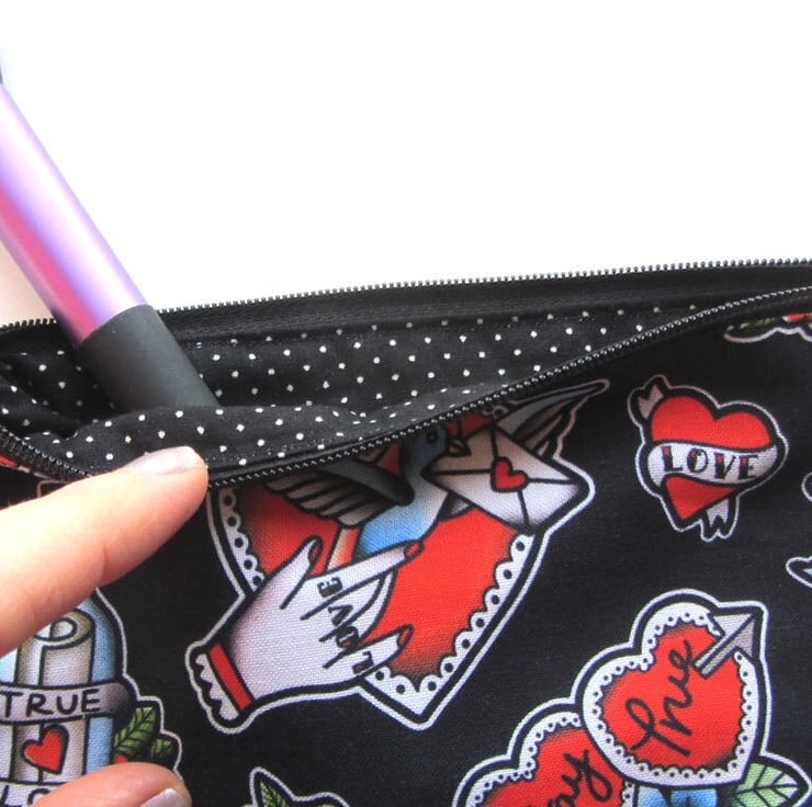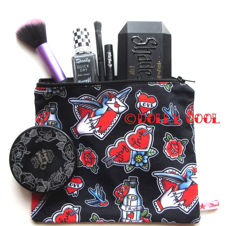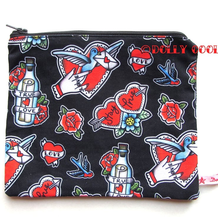 Tattoo Zipper Pouch by Dolly Cool Rose Swallow True Love Self Designed Fabric Heart Old School Tattoo Style Medium Size