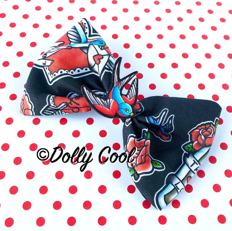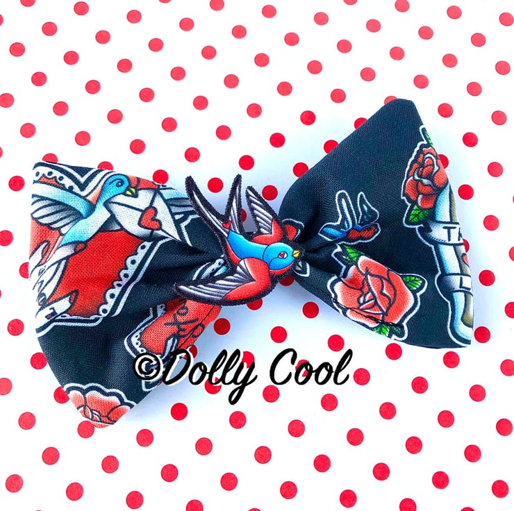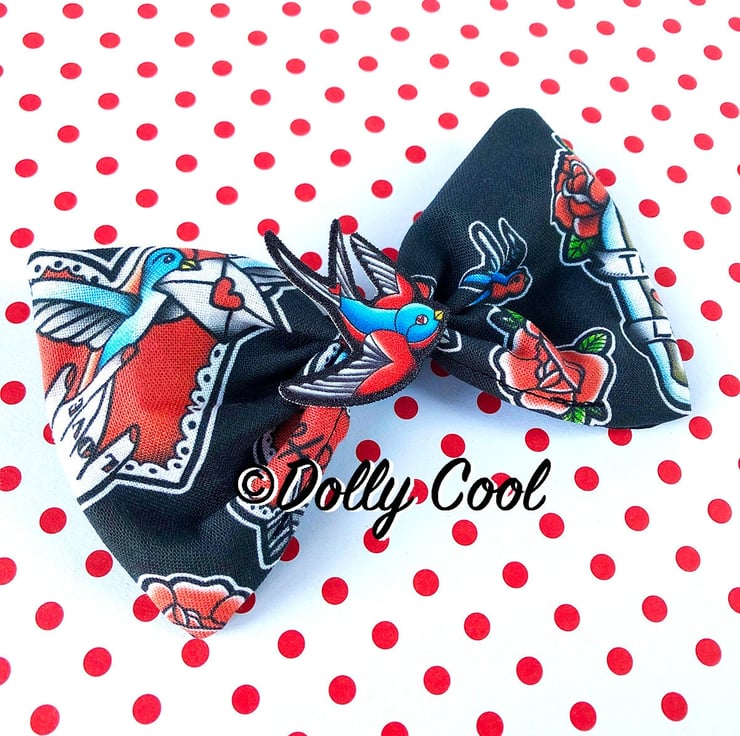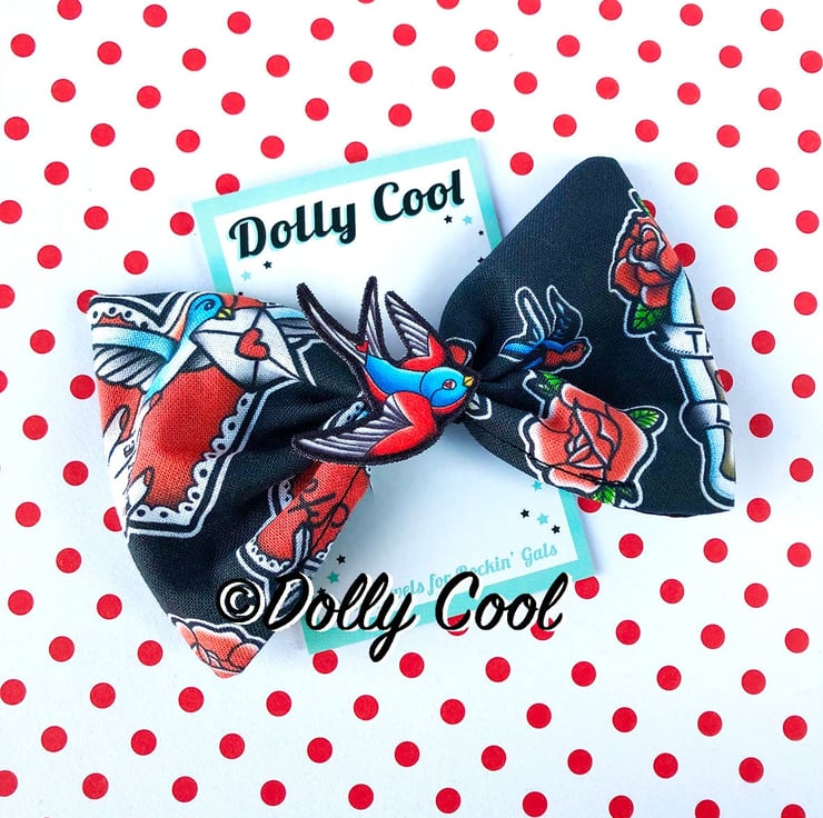 Tattoo Fabric Hair bow with Swallow illustrated charm exclusively by Dolly Cool - Rockabilly - Oversized