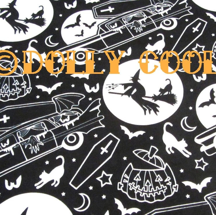Cotton patterned fabric with EXCLUSIVE ONLY TO DOLLY COOL Haunted Hearse Spooky print with witch, cat, bats, pumpkins, eyes, stars and moons! you can't get this anywhere else at all! It is my very own design that I have had printed :)