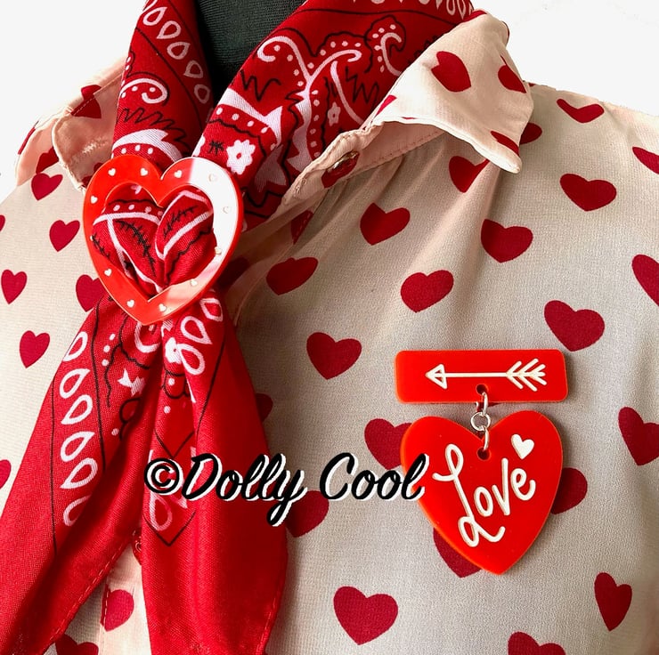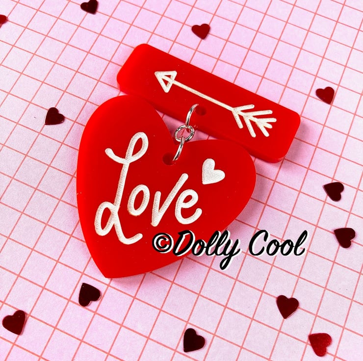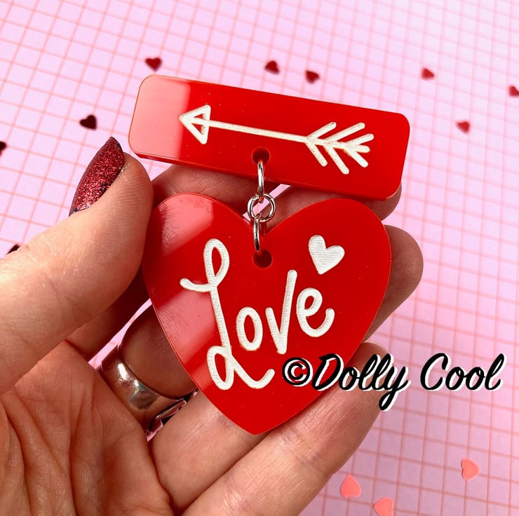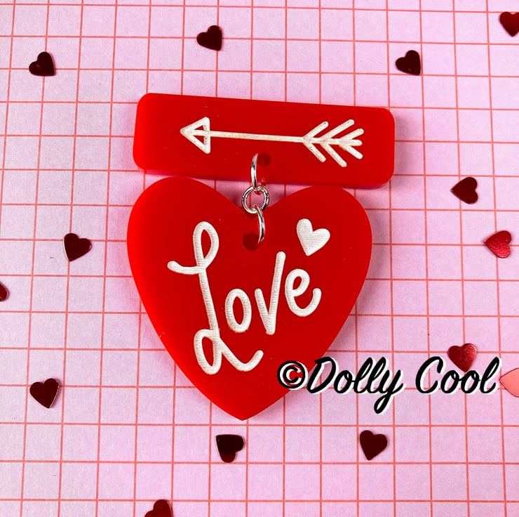 Inspired by the Novelty Pins of the 40s and 50s, this Arrow and Love Heart brooch is made from one of my original illustrations, and has been professionally laser cut and etched, and hand finished by me with acrylic paint detail and polished to a high shine. The Acrylic (plexiglass) is a gloss red with white painted accents, especially chosen for this project.