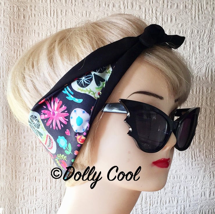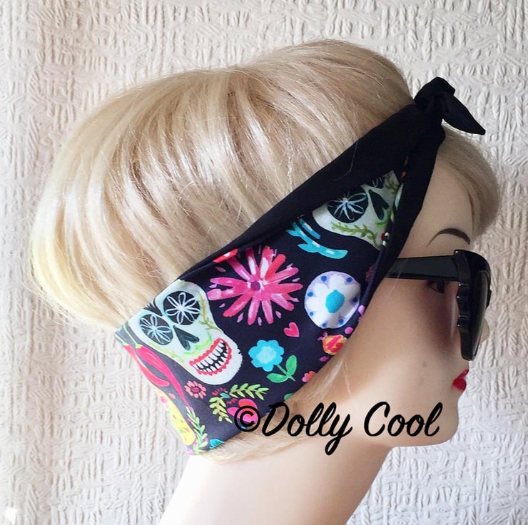 Sugar Skull Head Scarf by Dolly Cool - Hair Tie - Bandana - Day of The Dead - Flowers - Rockabilly - Dia De Los Muertos - Coco