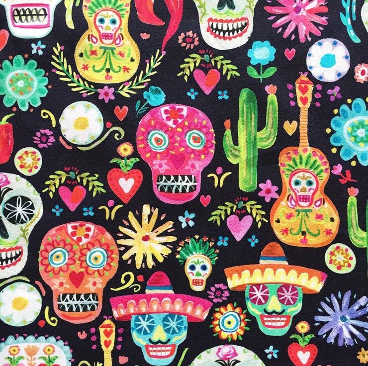 Cotton patterned fabric with all over Day of the Dead Sugar Skull & Flowers print on Very Dark Navy