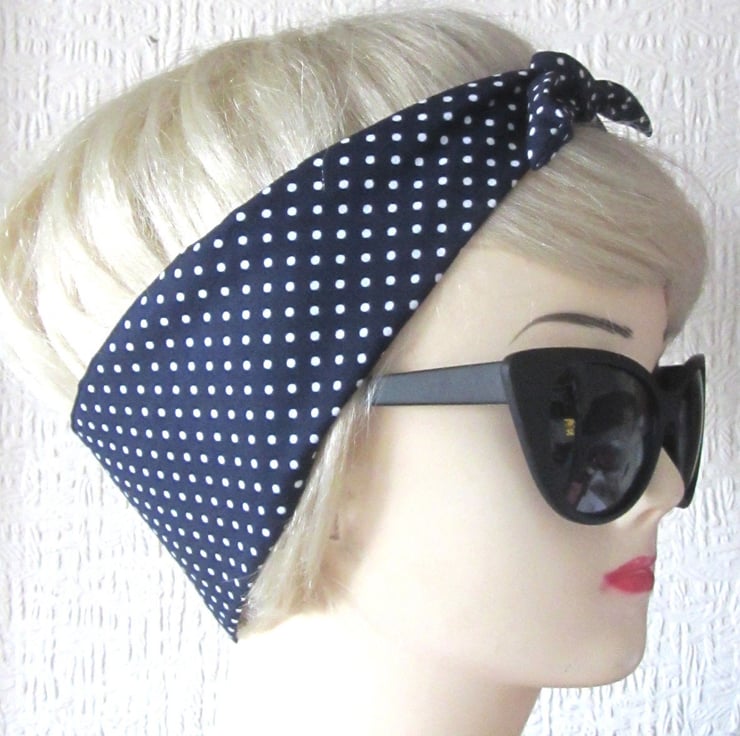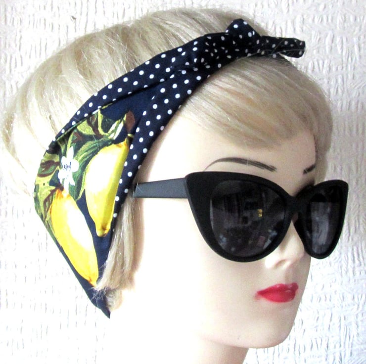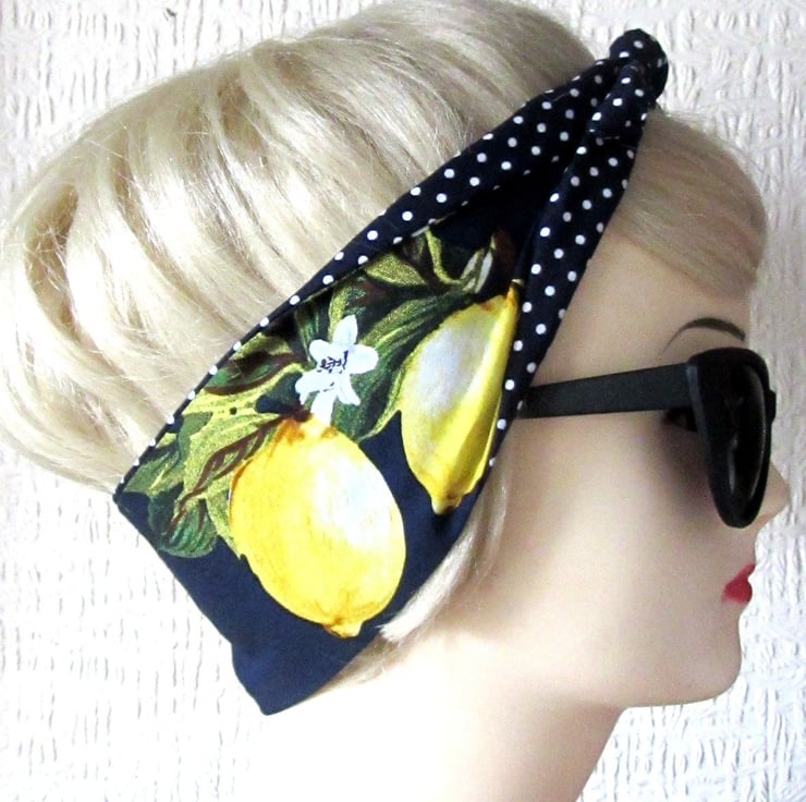 Lemon Print Navy Polka Dot Hair Tie Rockabilly Head Scarf by Dolly Cool Rockabilly Pin Up Carmen Miranda Fruit 50s