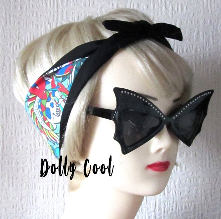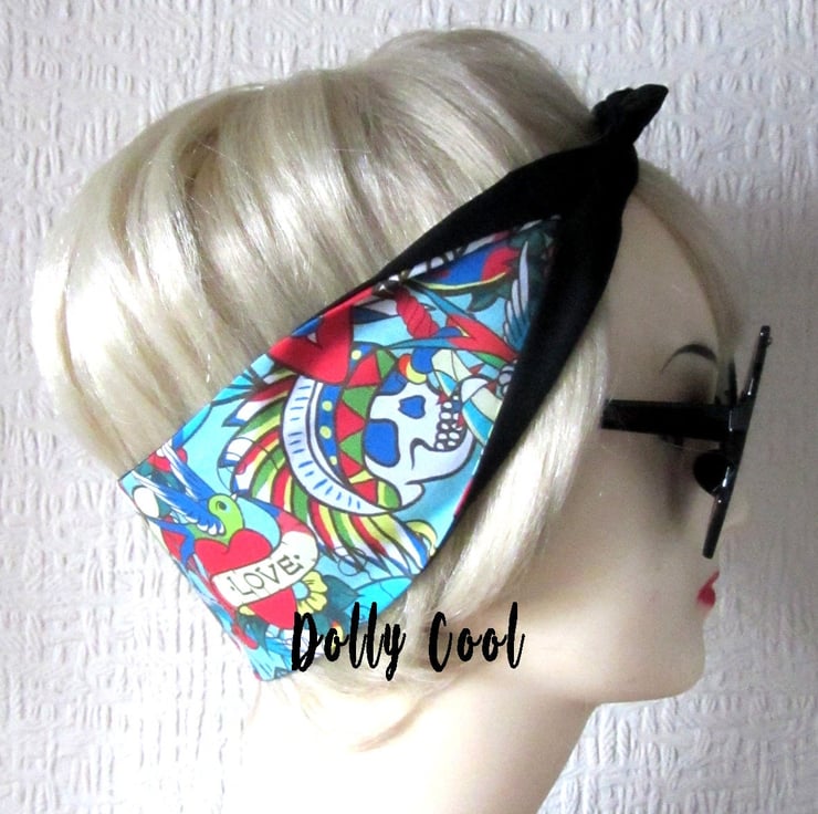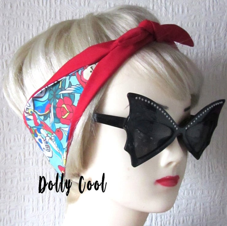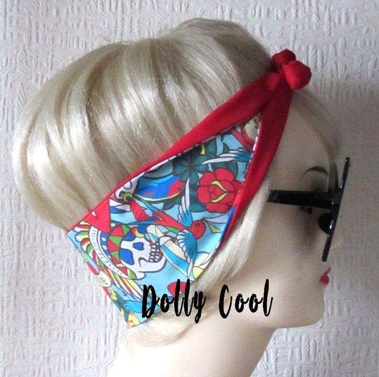 Tattoo Swallow Hair Tie Print Head Scarf by Dolly Cool - Your Choice of Red OR Black Backing