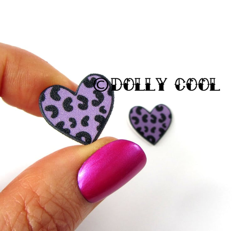 Heart Earrings in Purple Leopard Print by Dolly Cool Rockabilly Rock and Roll