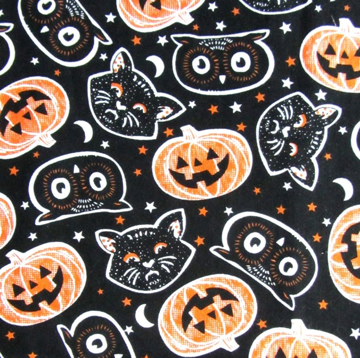 Cotton patterned fabric with Spooky Owl, Cat and Pumpkin Print