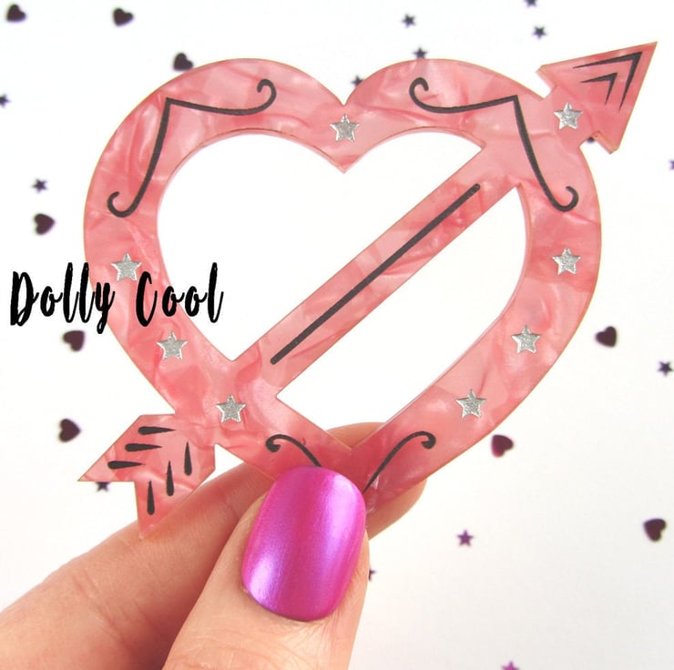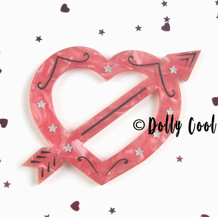 Inspired by the Novelty Pins of the 40s and 50s, this Heart and Arrow brooch is made from one of my original illustrations, and has been professionally laser cut and etched, and hand finished by me with acrylic paint detail and polished to a high shine. The Acrylic (plexiglass) is a beautiful swirl marbled semi-tranparent pink pearl, especially chosen for this project.