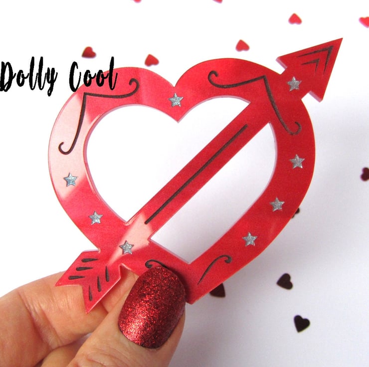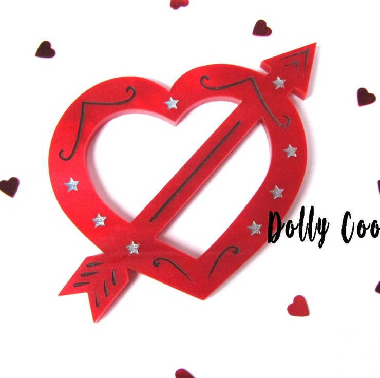 Inspired by the Novelty Pins of the 40s and 50s, this Heart and Arrow brooch is made from one of my original illustrations, and has been professionally laser cut and etched, and hand finished by me with acrylic paint detail and polished to a high shine. The Acrylic (plexiglass) is a beautiful swirl marbled red especially chosen for this project.