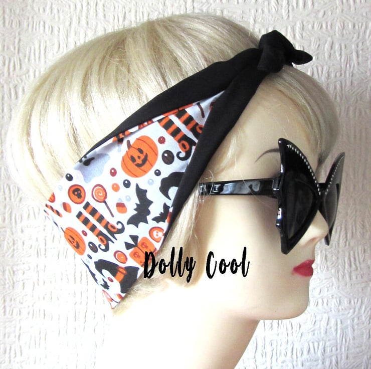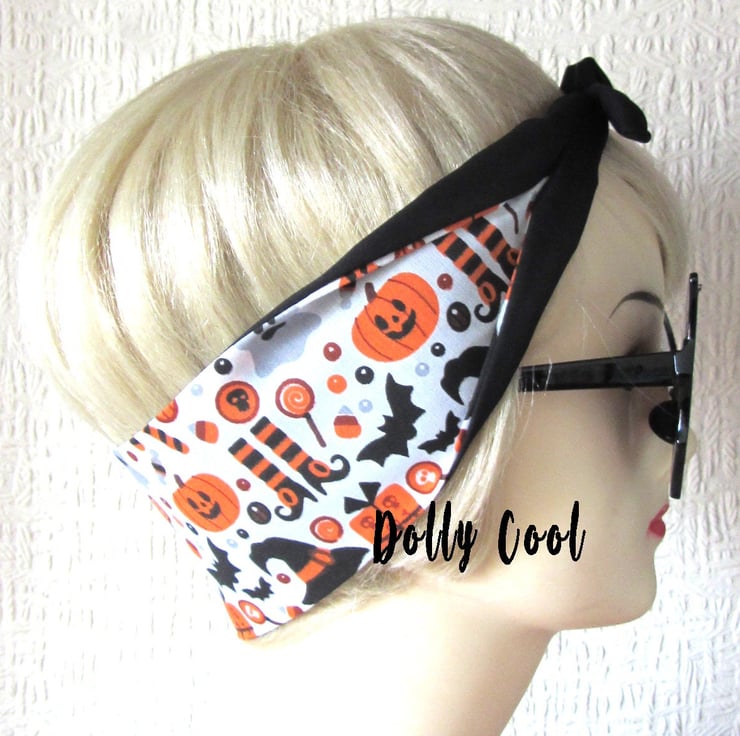 Halloween Pumpkin Witch Bat Hair Tie by Dolly Cool - Creepy Cute - Jack O Lantern - Head Scarf - Hair Band - Bandana - Hair Wrap