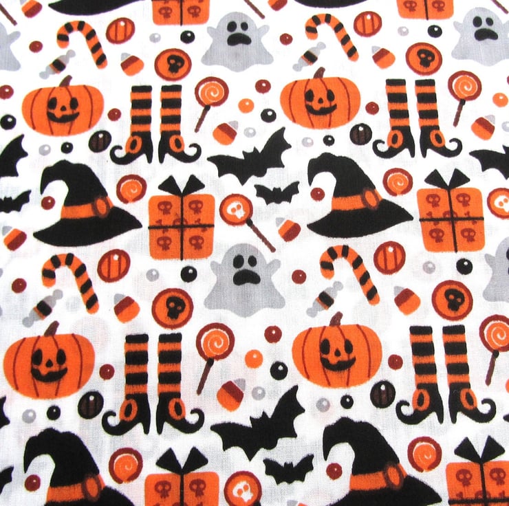Cotton patterned fabric with a cute all over Halloween Print on a white background