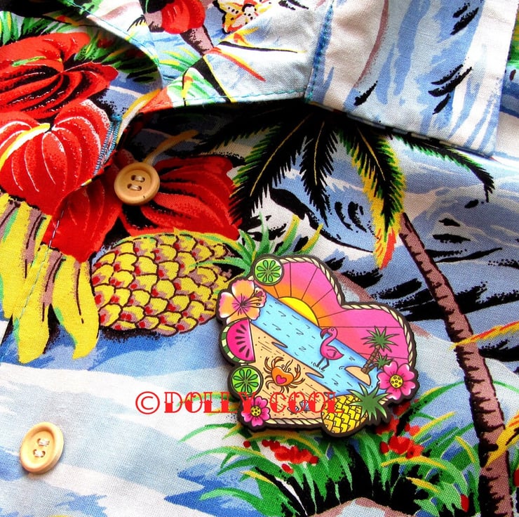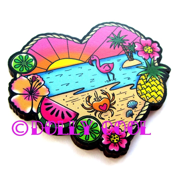Inspired by the Novelty Pins of the 40s and 50s, this 'Tropical Beach' brooch is made from one of my original illustrations, and has been professionally printed onto Maple plywood with a matte finish.
