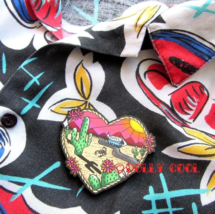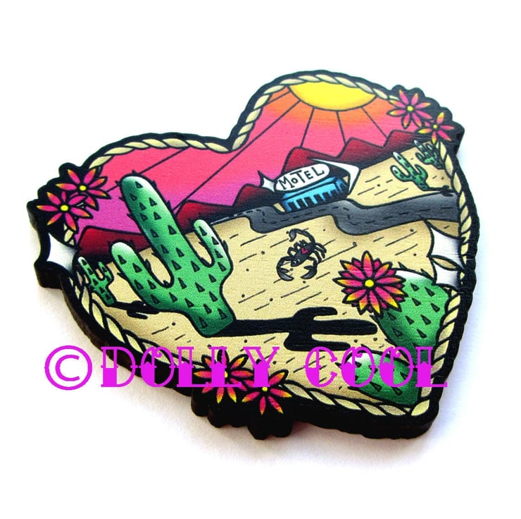 Inspired by the Novelty Pins of the 40s and 50s, this 'Western Desert' brooch is made from one of my original illustrations, and has been professionally printed onto Maple plywood with a matte finish.