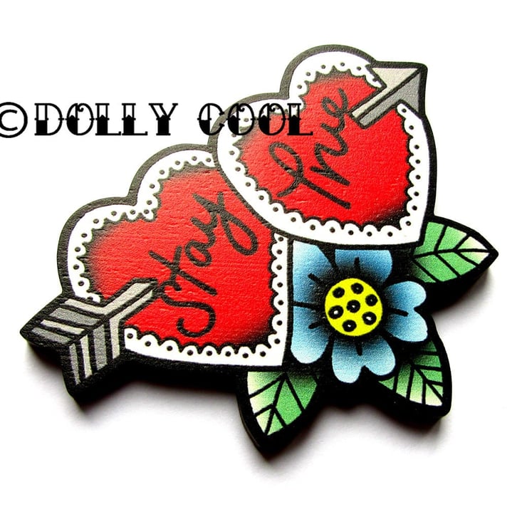 Stay True Sweetheart Brooch by Dolly Cool 40s 50s Reproduction Vintage Style Novelty Wooden Pin WW2