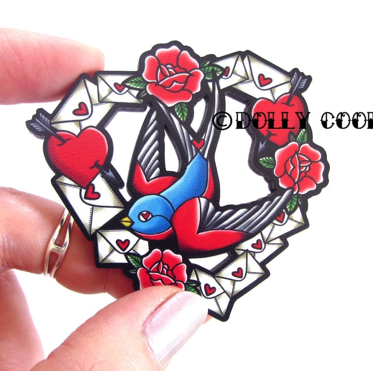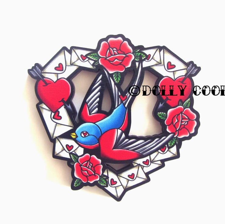 Swallow Love Letter Cut Out Brooch by Dolly Cool 40s 50s Reproduction Vintage Style Novelty Wooden Pin WW2 Rose Tattoo Illustrated Sparrow