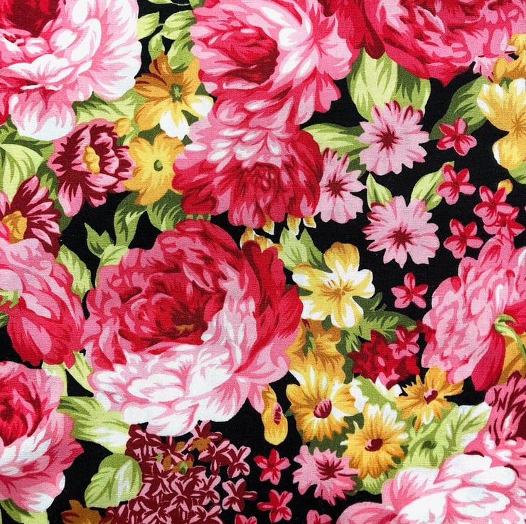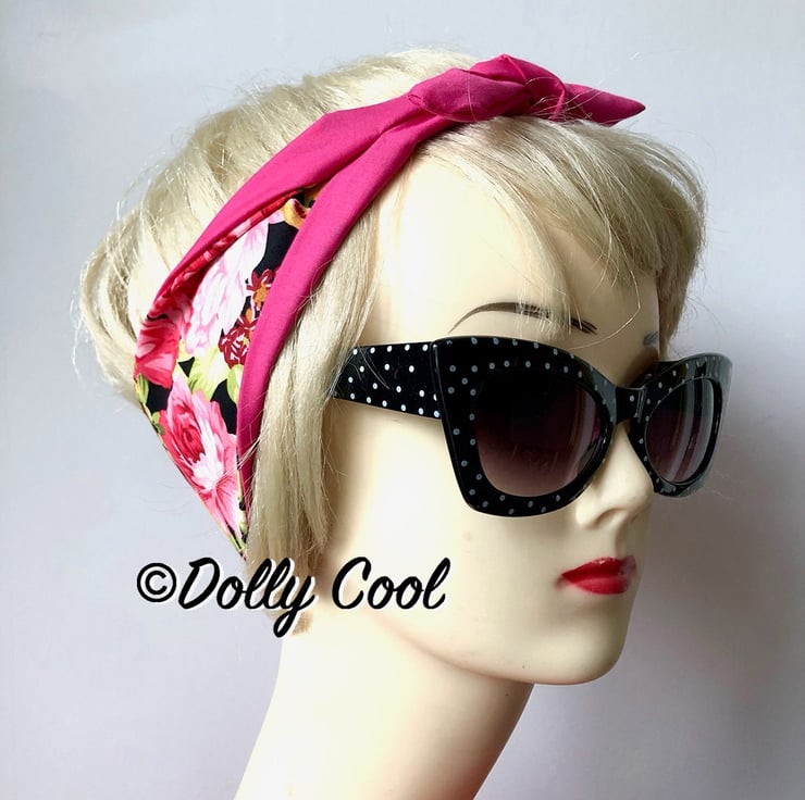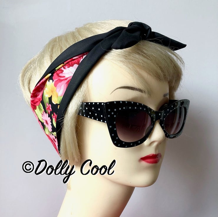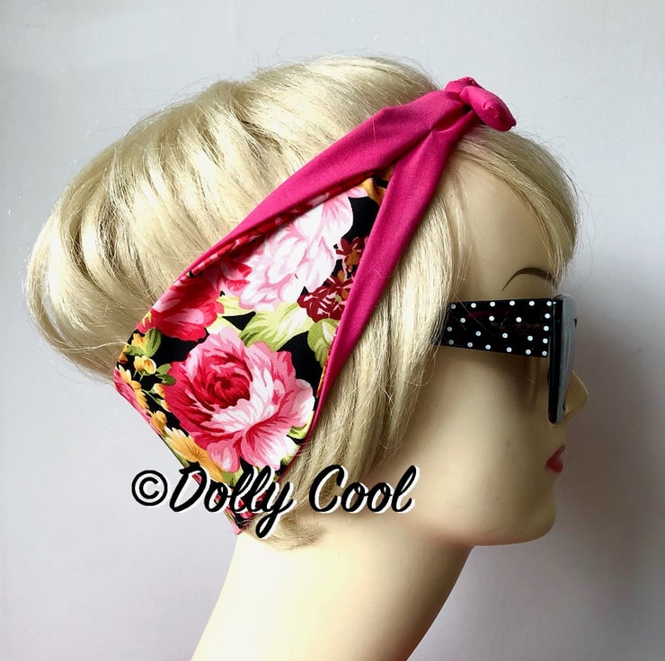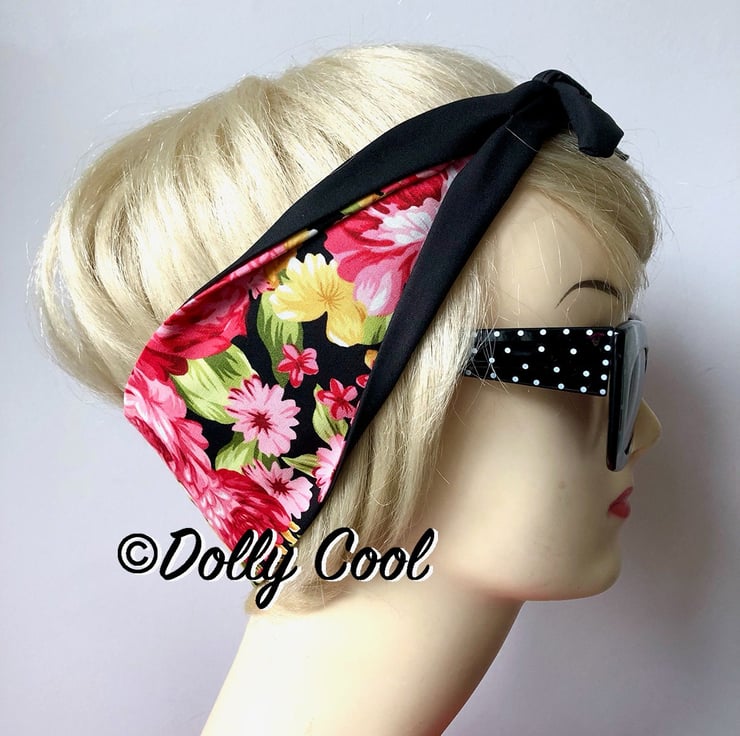 Summer Flowers Hair Tie Print Head Scarf by Dolly Cool - Your Choice of Pink OR Black Backing - Bandana - Rockabilly - Peony
