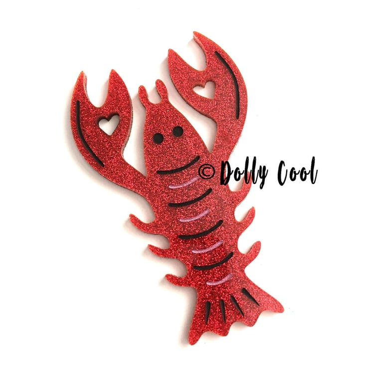 Lobster Acrylic Brooch by Dolly Cool - Red Sparkle - Vintage Style Novelty Brooch - Fakelite - Glitter Acrylic