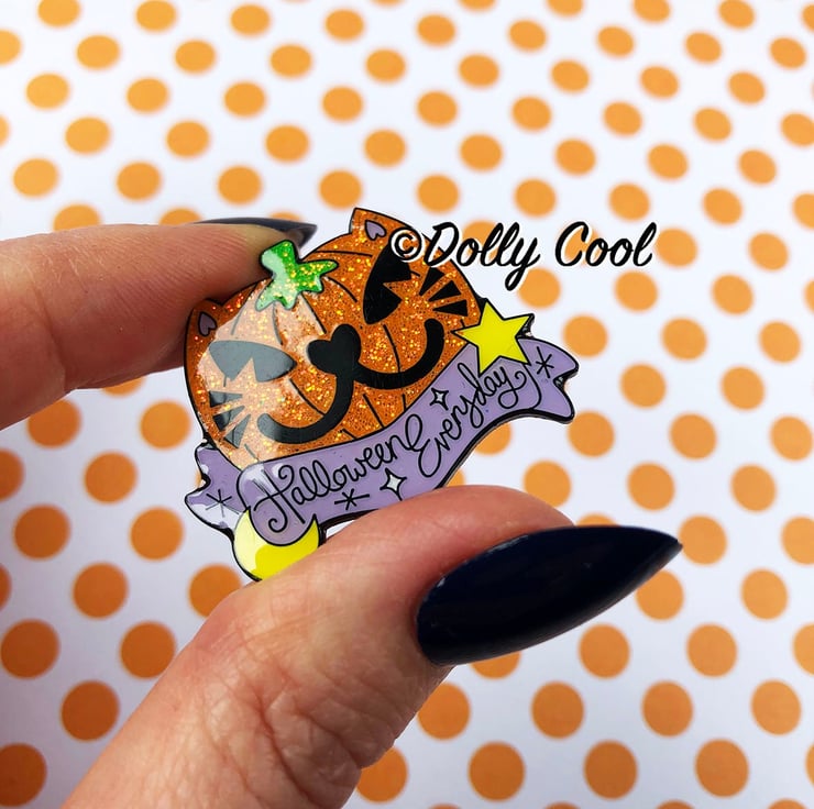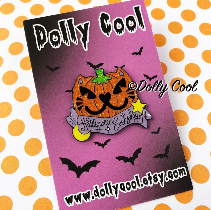 This enamel pin is made from one of my original illustrations, and features beautiful bright and iridescent glitter to the cat pumpkin, with a super shiny gloss finish. The banner reads 'Halloween Everyday' so you can celebrate spooky season all year round!