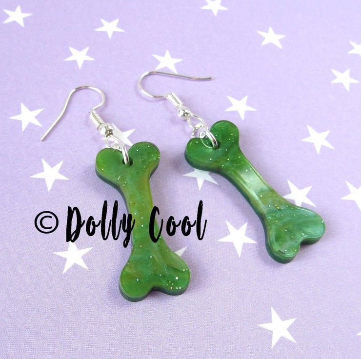 These Bone earrings are made from one of my original illustrations, and have been professionally laser cut and hand polished to a high shine. The Acrylic (plexiglass) is a beautiful Green marble sparkle especially chosen for this project.