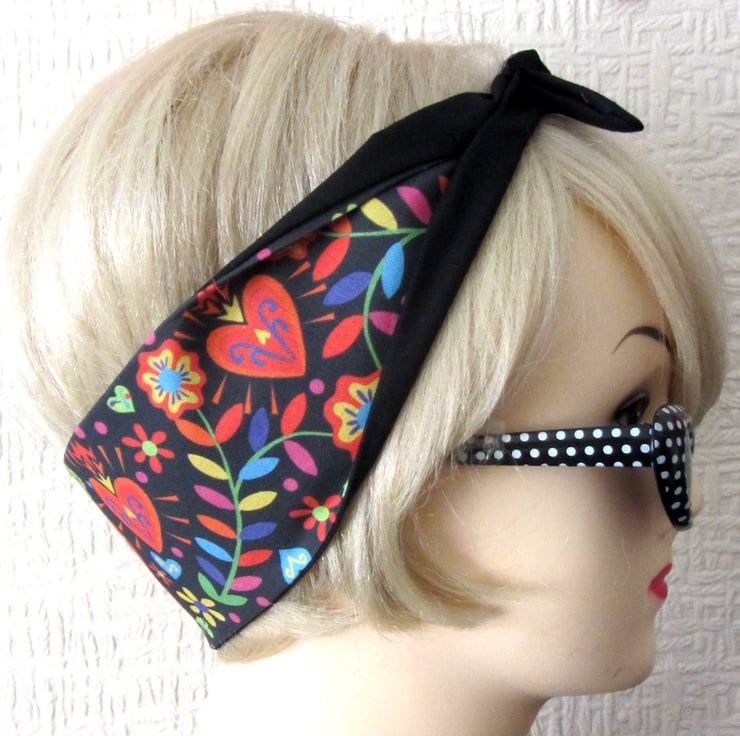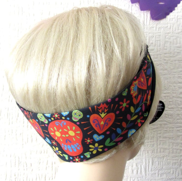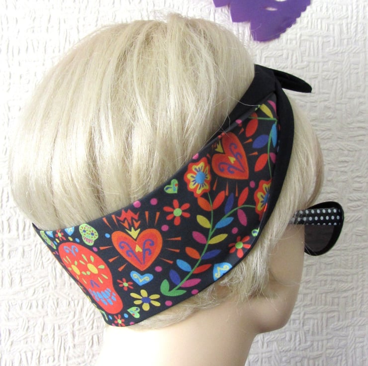 Mexican Folk Art Hair Tie - Head Band - Bandana - Rockabilly style - by Dolly Cool - Sugar Skull - Sacred Heart - Dia De Los Muertos