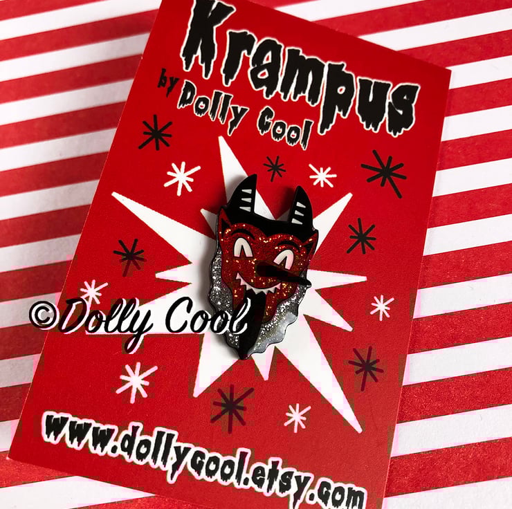 This Krampus enamel pin is made from one of my original illustrations, and is filled with super sparkly red and silver glitters on a black metal base, with a polished high shine finish.