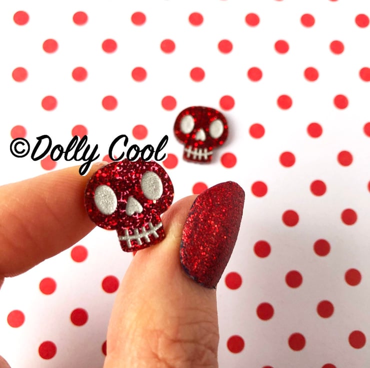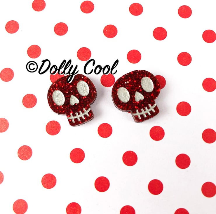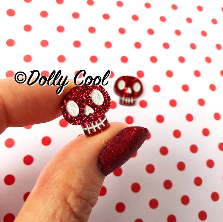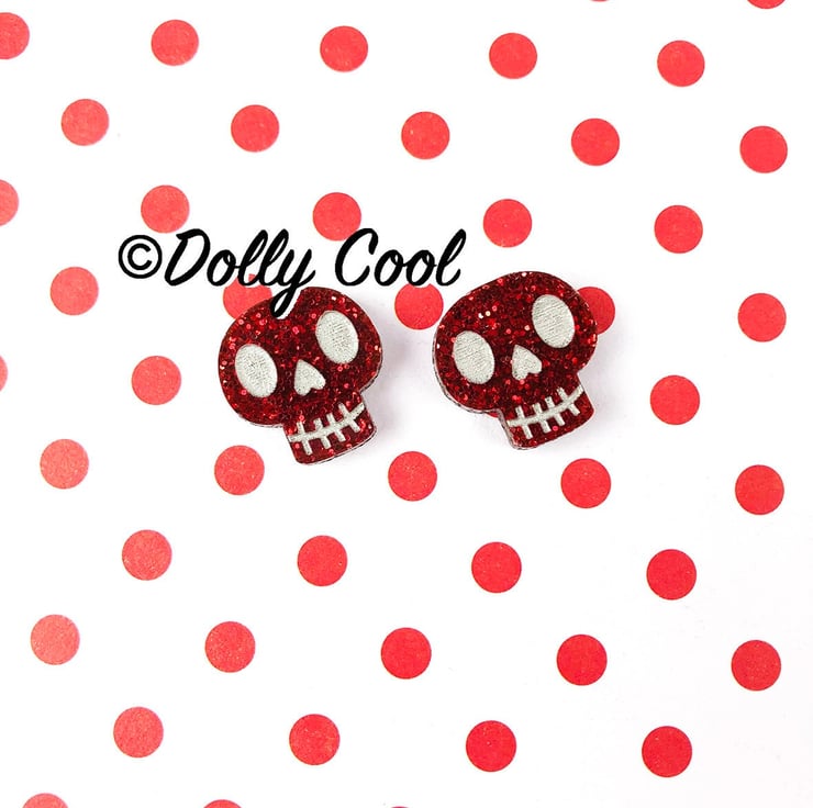 These Skull earrings are made from one of my original illustrations, and have been professionally laser cut and etched, and hand finished by me with acrylic paint detail and polished to a high shine. The Acrylic (plexiglass) is a beautiful Red glitter sparkle, especially chosen for this project.