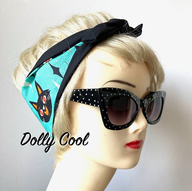 Cat Face Hair Tie in Aqua and White - Rockabilly Head Scarf - Hair Wrap - by Dolly Cool - Atomic - Kitty - Starburst - Mid Century