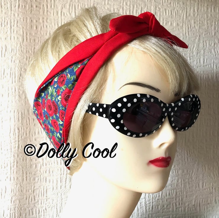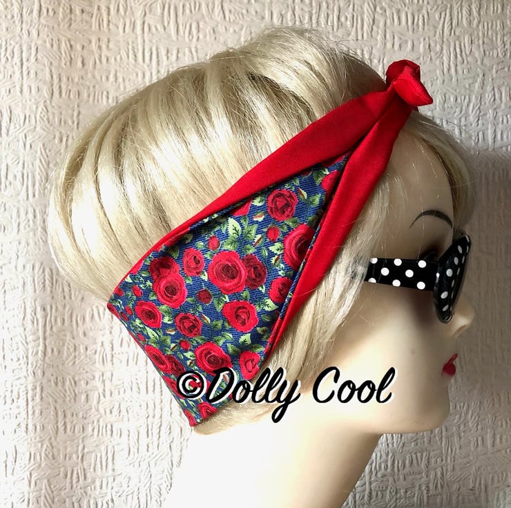 Red Rose on Blue Denim Chambray Hair Tie Rockabilly Head Scarf by Dolly Cool - Rockabilly - Pin Up