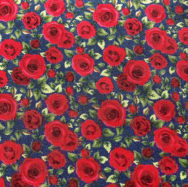 Cotton patterned fabric with all over Red Rose print on blue denim chambray