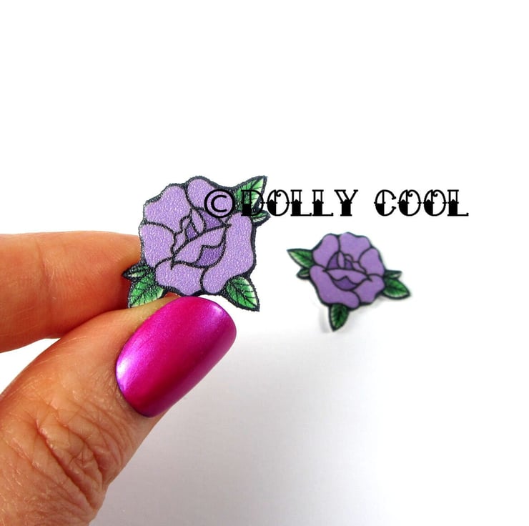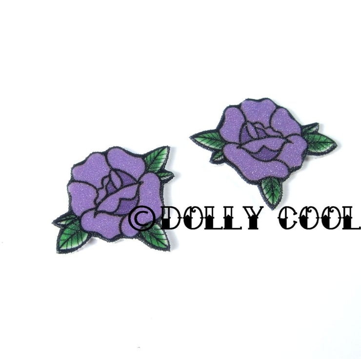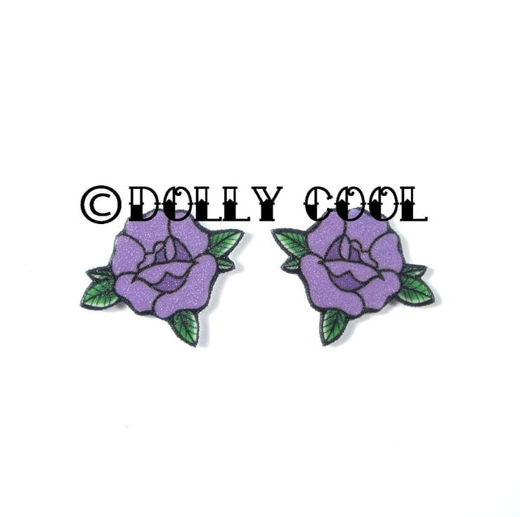Rose Earrings in Purple - Rockabilly Tattoo Flash Old School Style by Dolly Cool