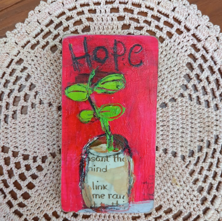 The importance of hope. The beginning of spring. My small painting is on reclaimed wood, a hook on the back and lightly varnished. A spring inspired gift. Mixed media a little one off. Seedling of hope