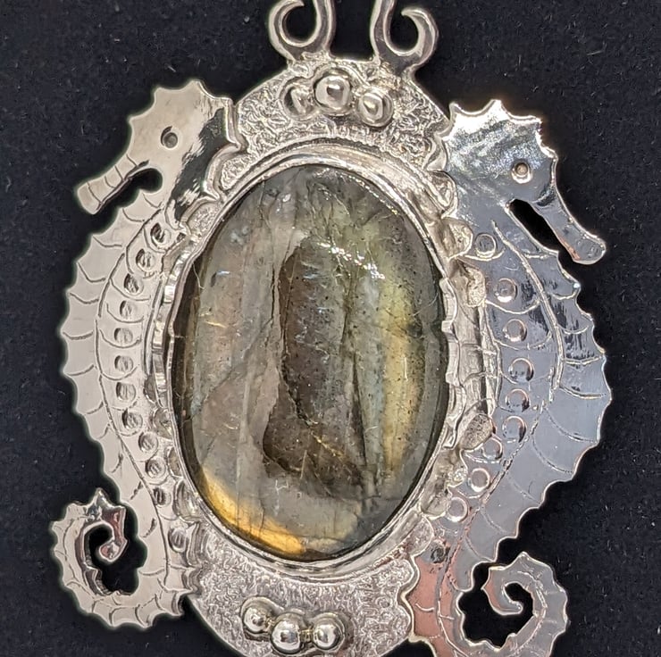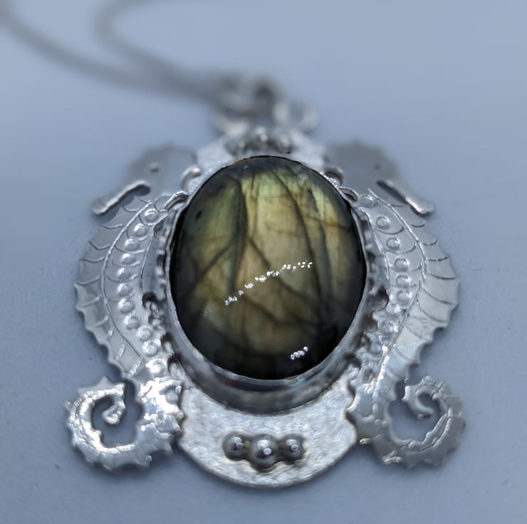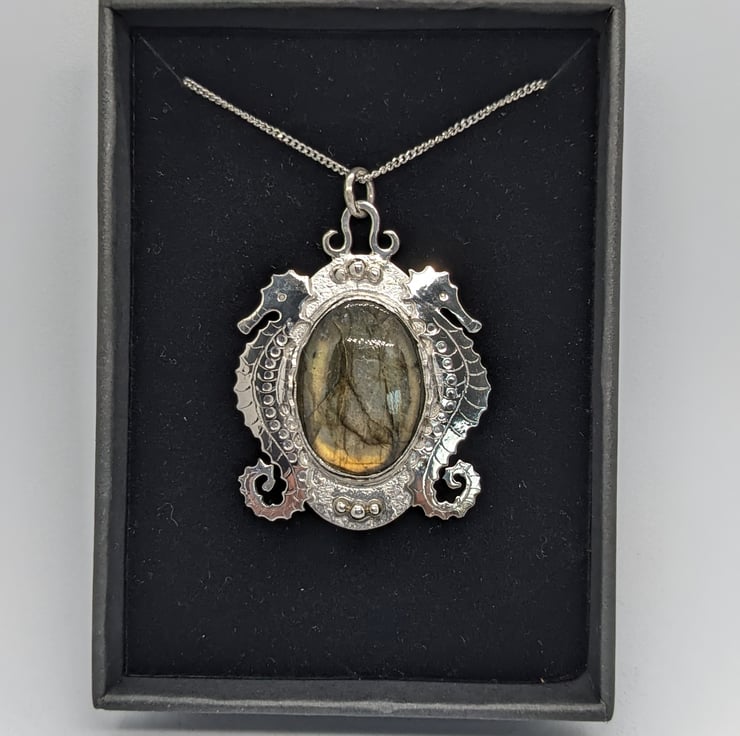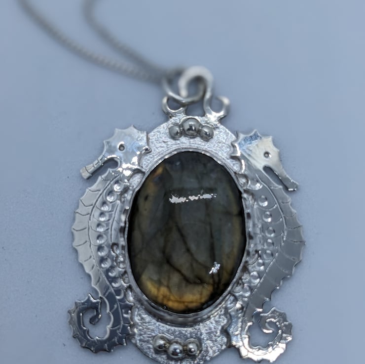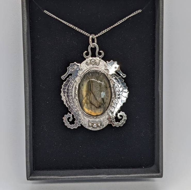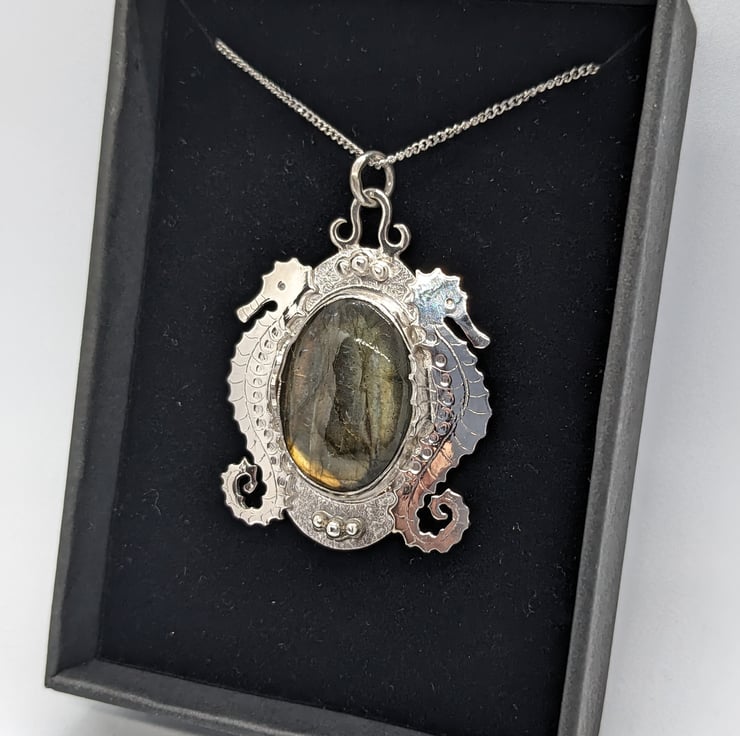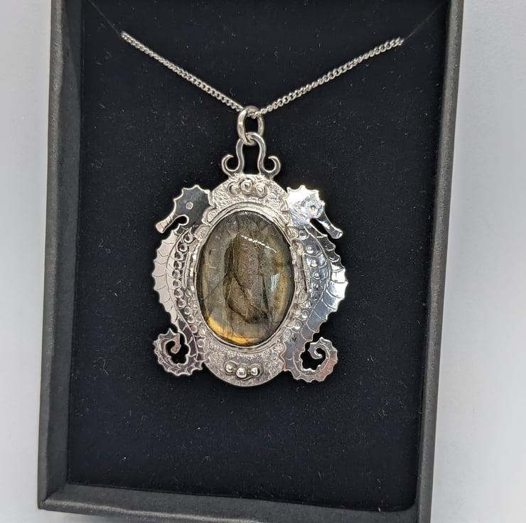 Is there any creature more endearing than a seahorse? Whilst I could not capture their vivid colours in silver, I wanted to recreate their fascinating texture and curves. My two sterling silver seahorses surround a large oval labradorite stone that seemed to me to be reminiscent of the depths of the ocean. I have added granulated silver balls and a hand forged bail that adds to the elegance of the piece. This statement pendant measures approximately 3.4cm wide and 3.7 cm deep and hangs from an 18 inch sterling silver curb chain.
