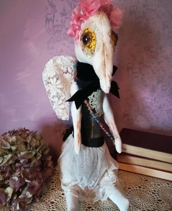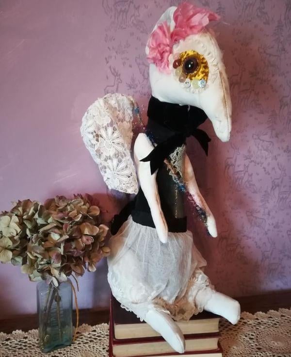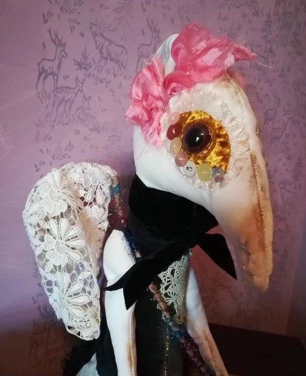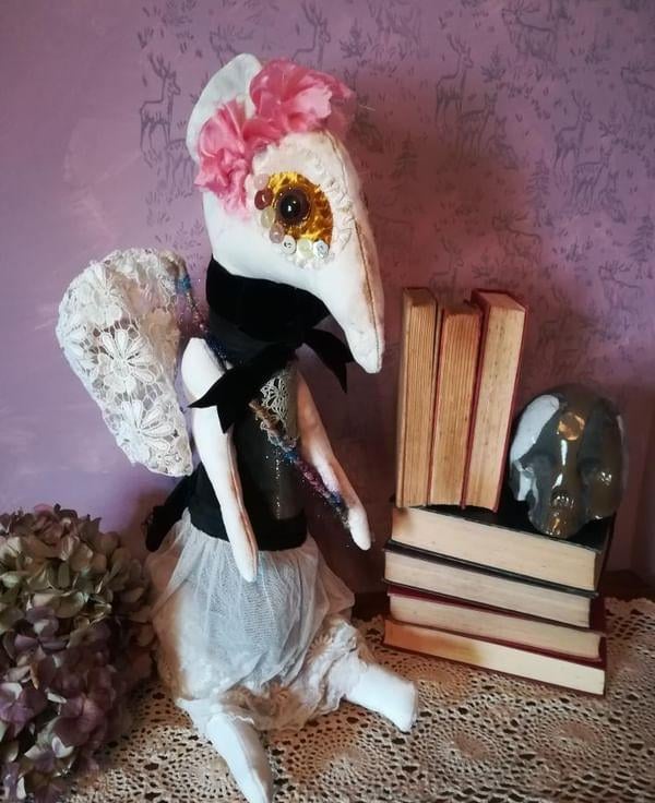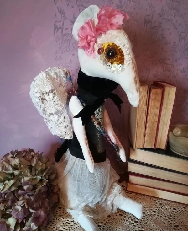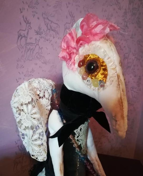 She has a skirt made from a stunning piece of worn antique, lacey fabric. A large black velvet ribbon bow at her neck, stitched detaiks and embellishments.
