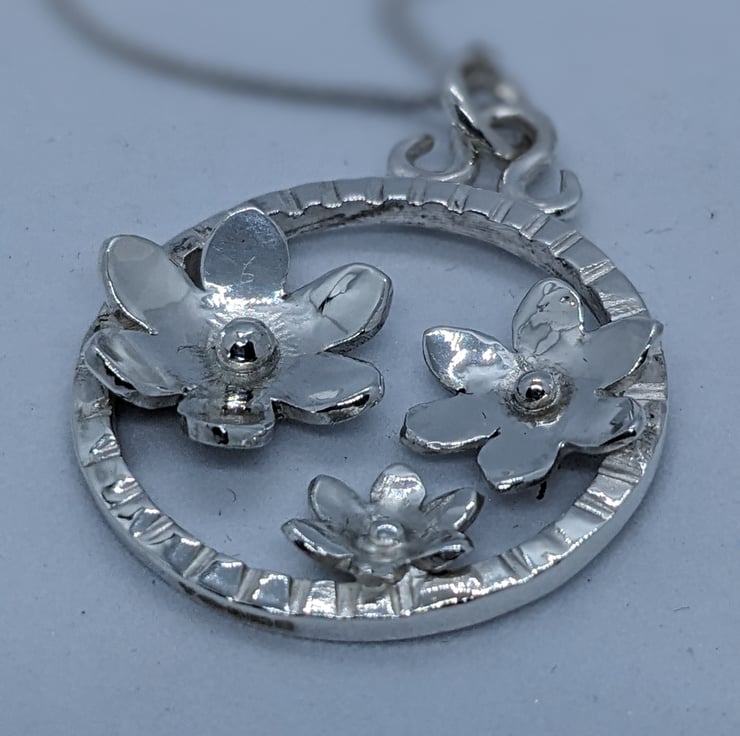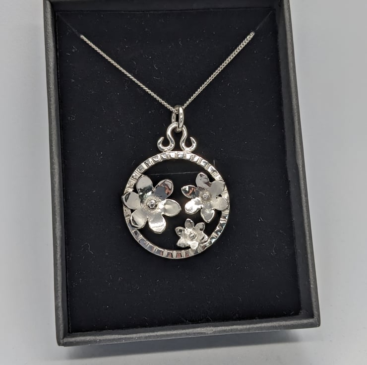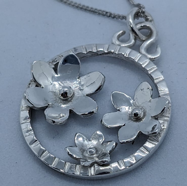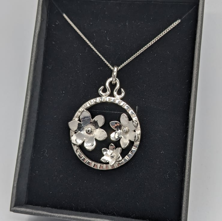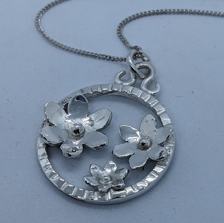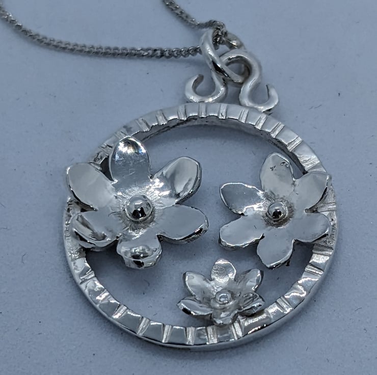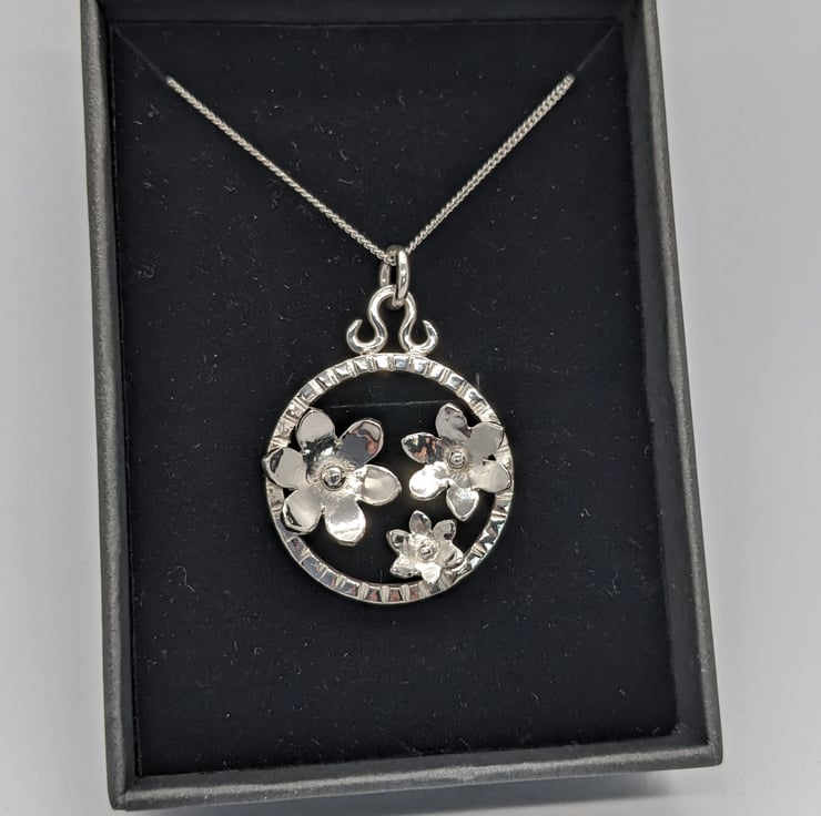 This elegant, sterling silver pendant features three hand saw pierced flowers set within a handmade textured silver ring, measuring approximately 3 cm in diameter. The flowers have been shaped and a granulated silver ball placed at the centre of each. A hand forged bail and jump ring are used to suspend the pendant from an 18 inch curb chain. This is an elegant piece, which would make a unique jewellery gift. It is hallmarked.