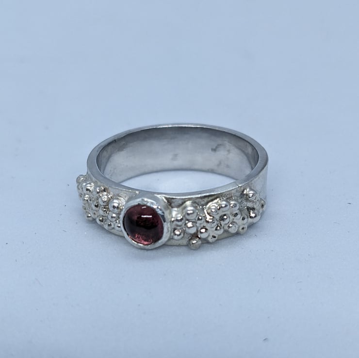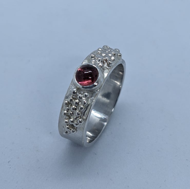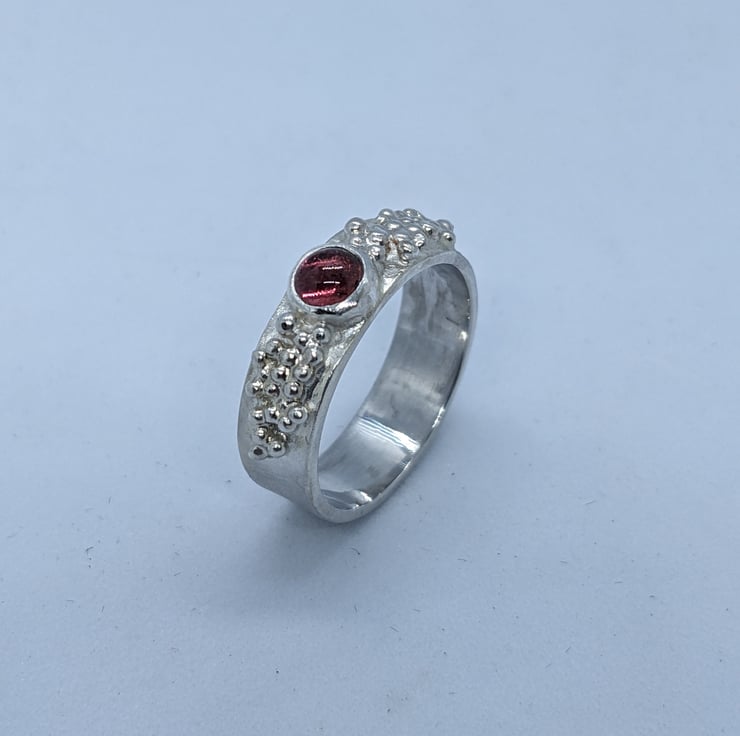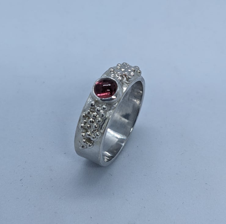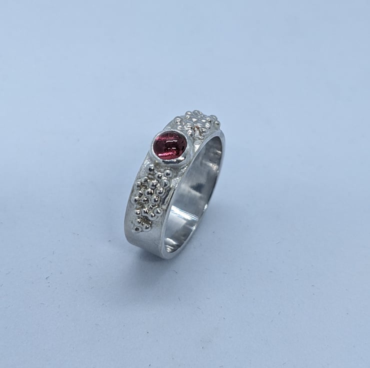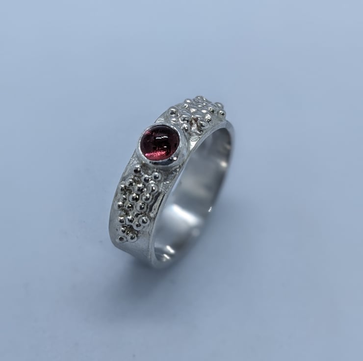 This pretty tourmaline ring is completely handmade. A delicate pink tourmaline stone is bezel set at the centre of the ring and this is surrounded by multiple tiny sterling silver granulated balls. The main band is polished to a satin finish to contrast with the shiny granulated balls.The ring is hallmarked. The ring is a size P.