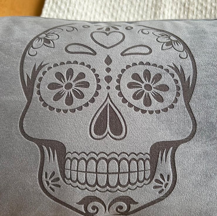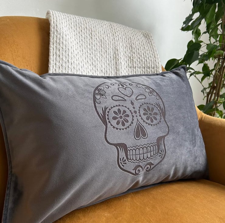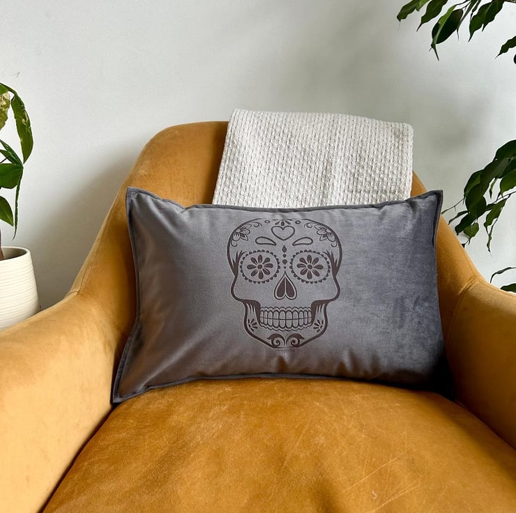 This fabulous velvet cushion cover features a lovely sugar skull etched into the fabric.