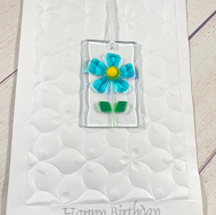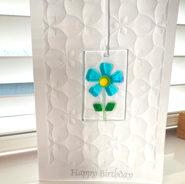 Fused glass retro card hanging in hand embossed cards with silver “ happy birthday “ printed . Once the card is no longer needed simply detach from the card and hand . The glass hanging comes drilled and strung with ribbon .