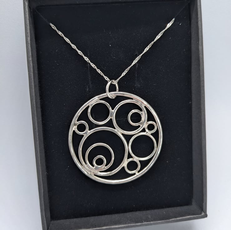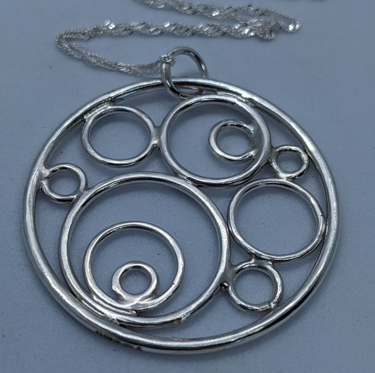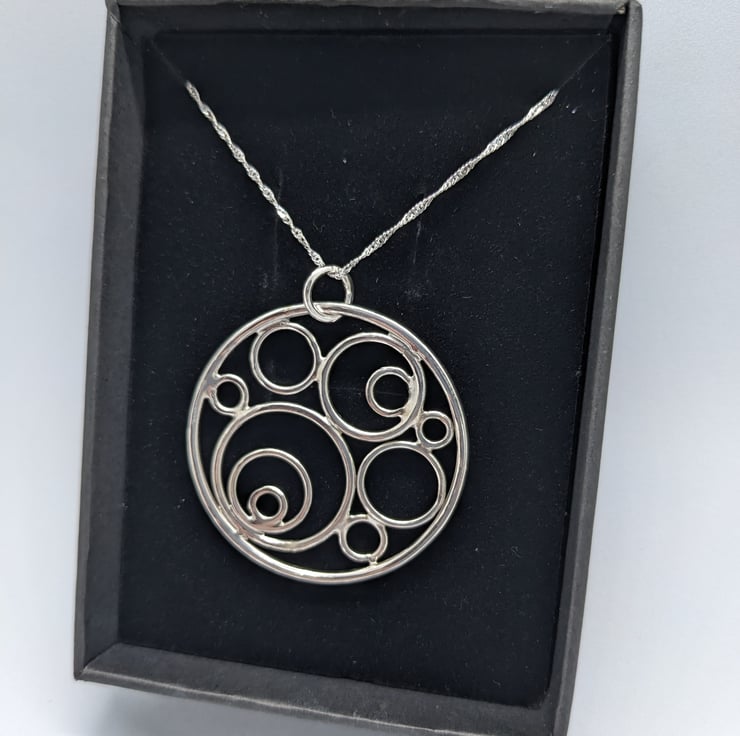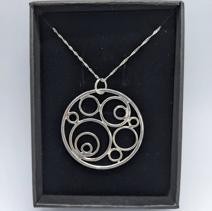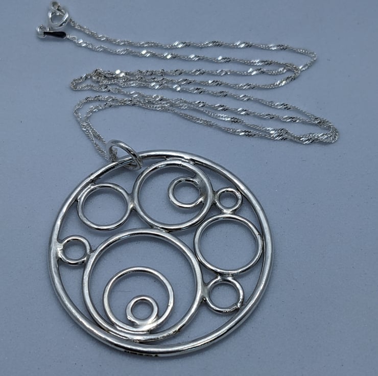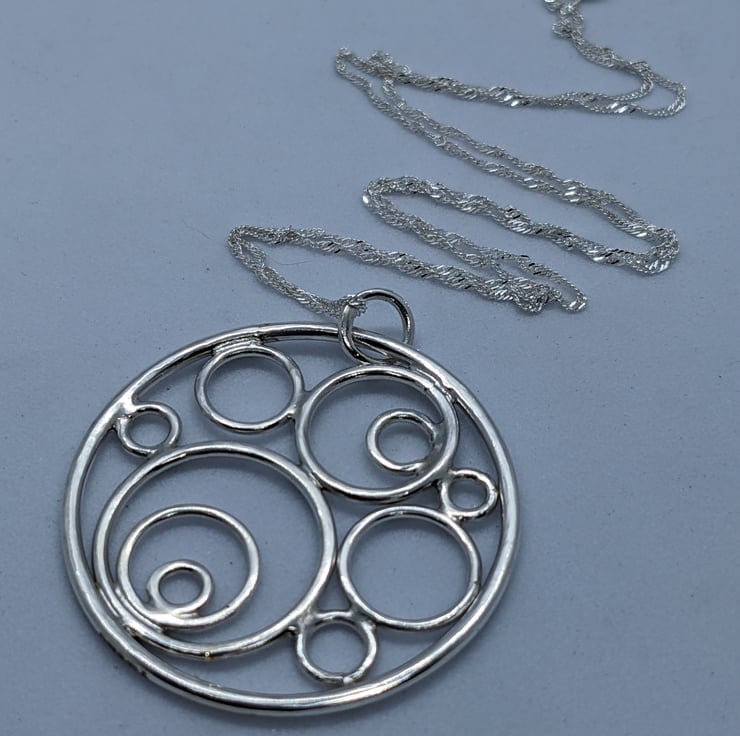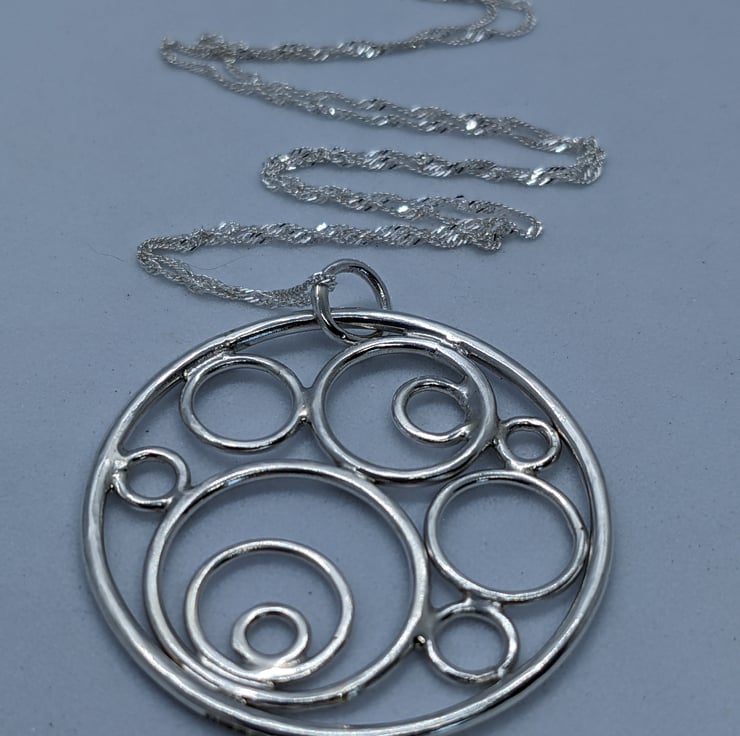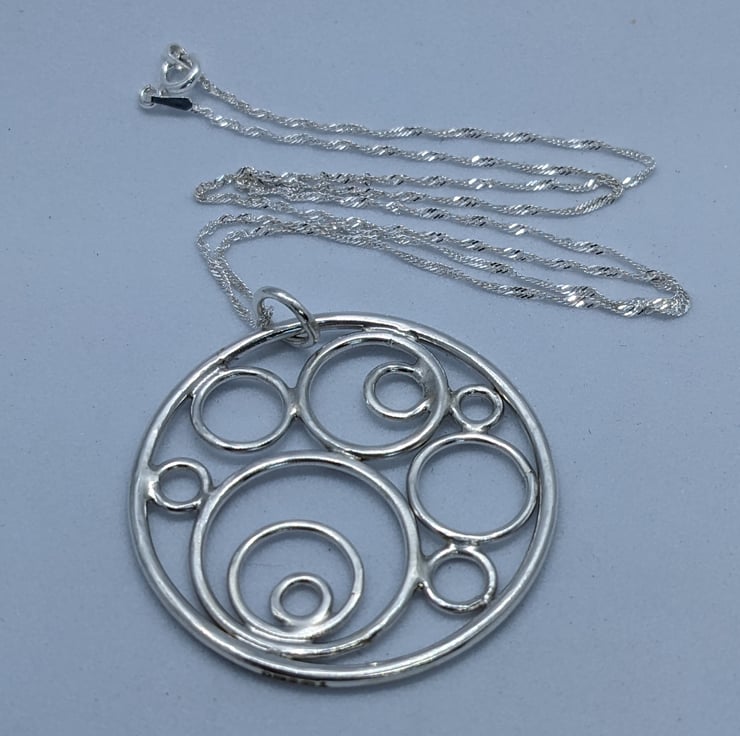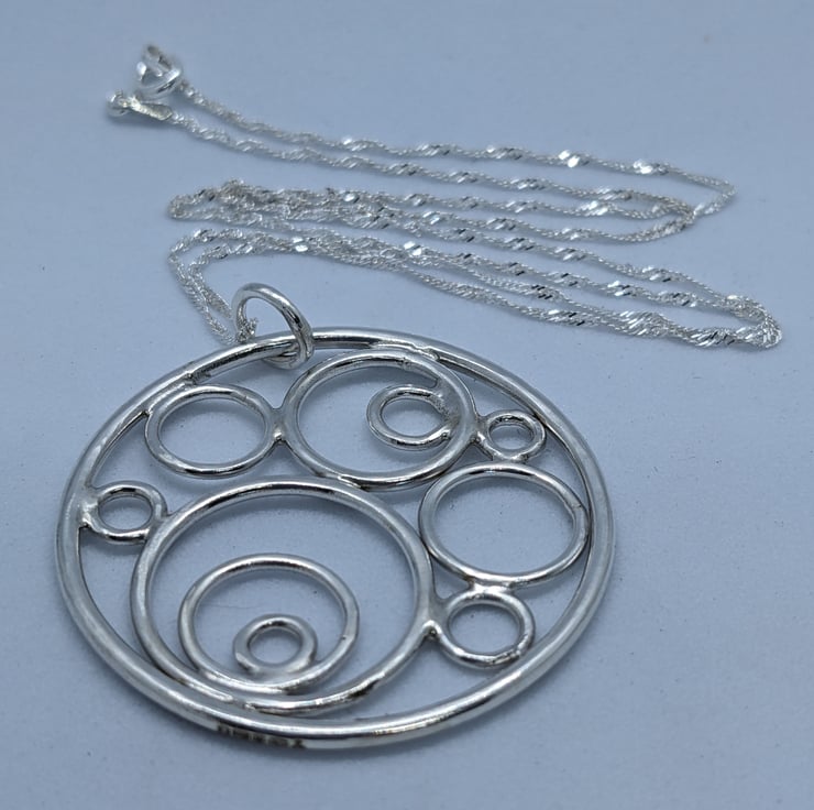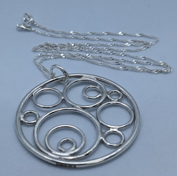 A circular pendant made from multiple handcrafted sterling silver rings of various sizes soldered within a large sterling silver ring. The pendant measures approximately 3.7cm in diameter and is hallmarked. It hangs from an 18 inch sterling silver twisted chain via a handmade jump ring.