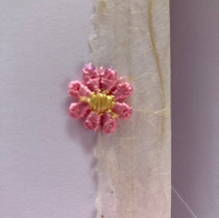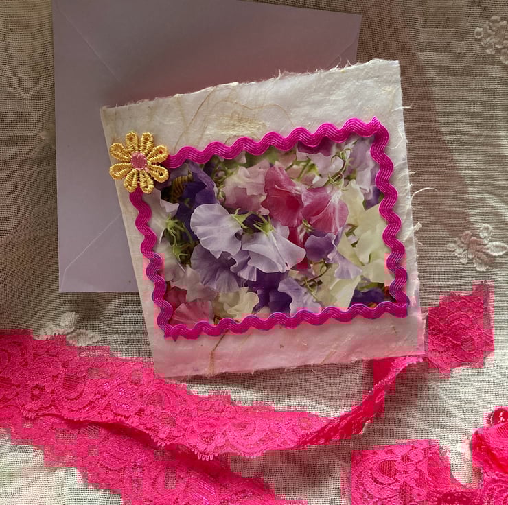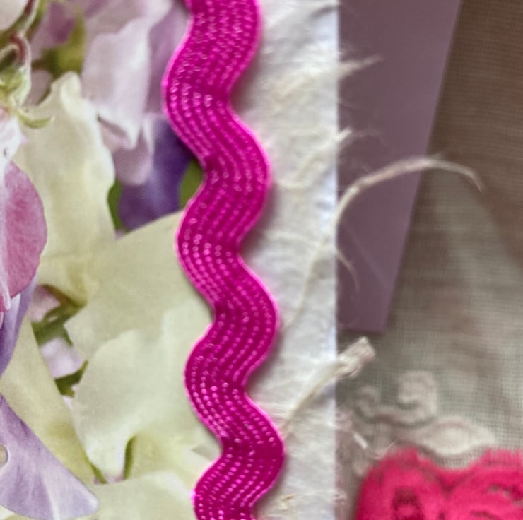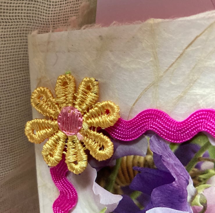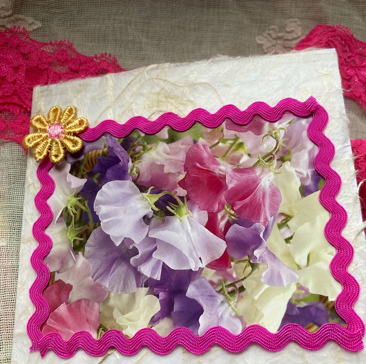 A pretty picture of sweet peas sits in the middle framed by pink zig zag braid. A pretty yellow and pink flower sits on the top left corner.