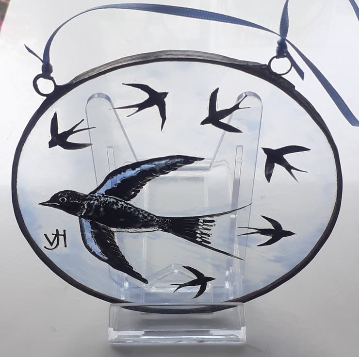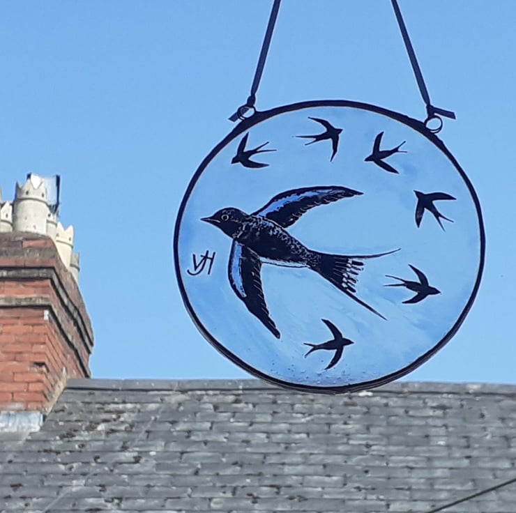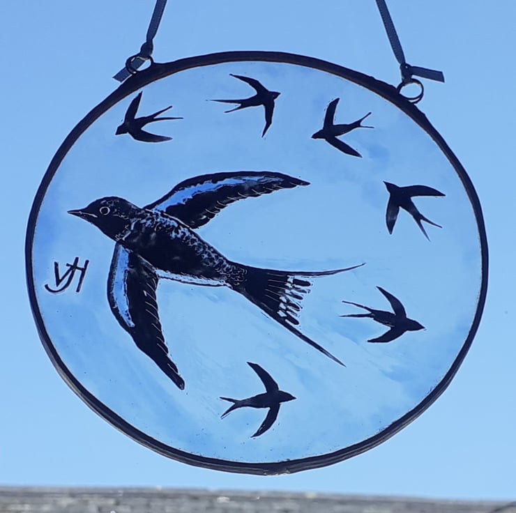 A beautiful hand painted stained glass panel depicting Swallows flying through our summer skies.