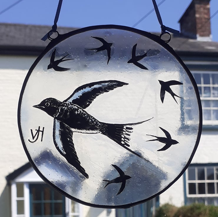 I have always been drawn to these amazing migratory birds, their acrobatic displays are a marvel to watch. I have strived to depict this movement in the glass, their joy for life and speed.