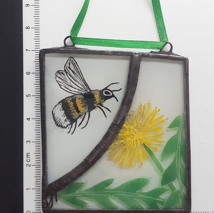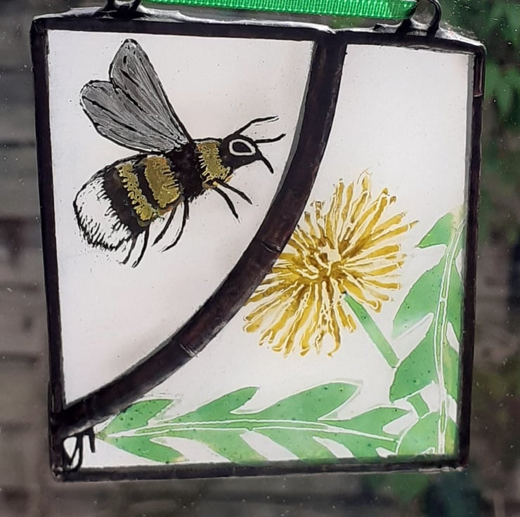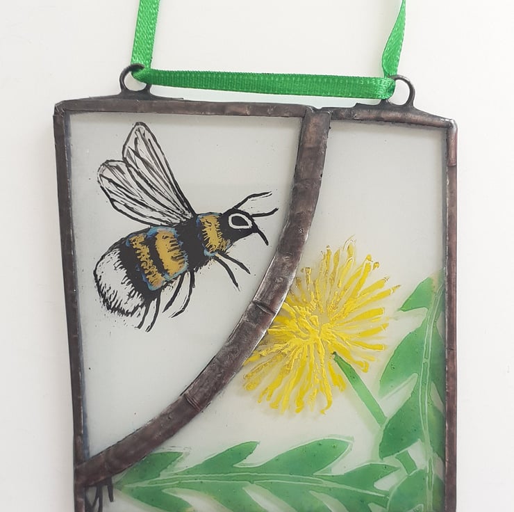 An original stained glass Bumblebee & Dandelion hanging for your window or porch.