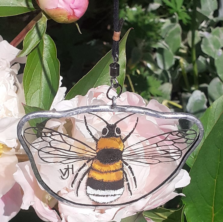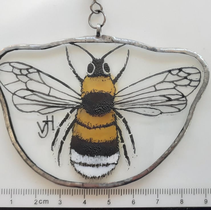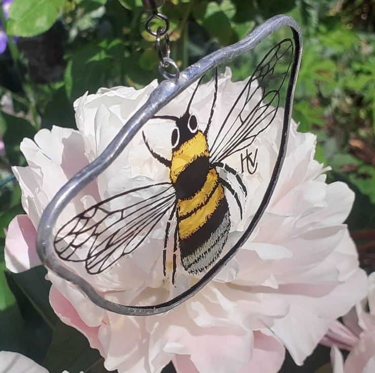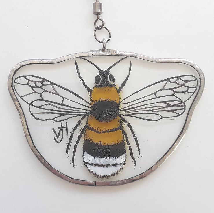 Traditional stained glass techniques are used, the bumblebee has been painted with black pigment and silver stain and fired to make the design permanent.