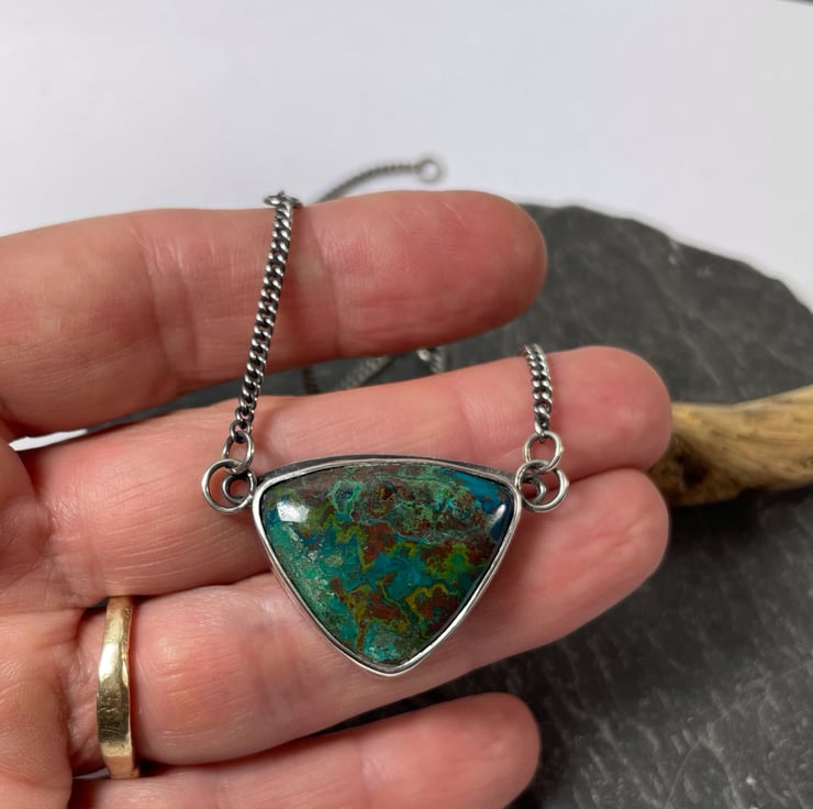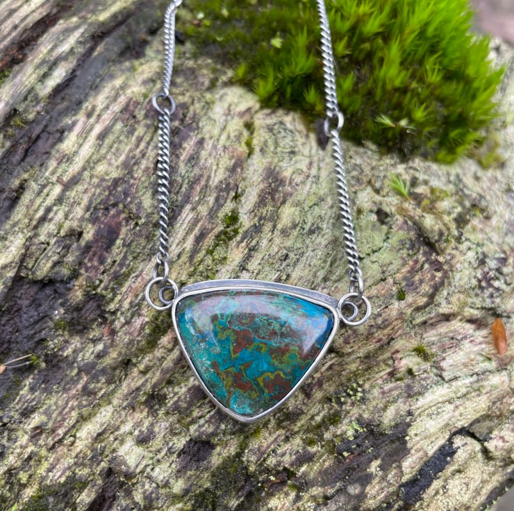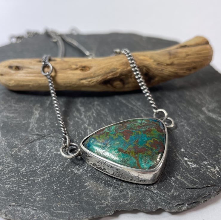 I have set this lovely triangular stone in a thick textured silver bezel. I have hung it from a silver chain with decorative rings at intervals. The silver has been oxidised in the recesses.