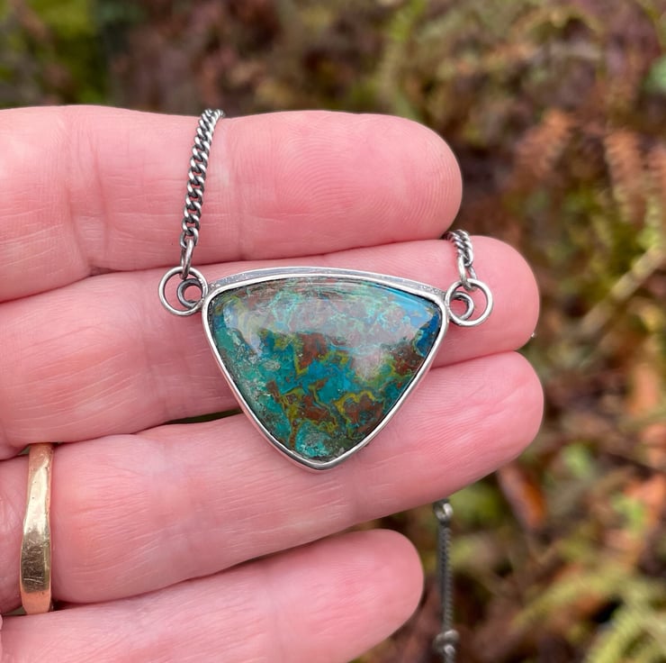 A beautiful azurite chrysocolla cabochon pendant on a silver chain.